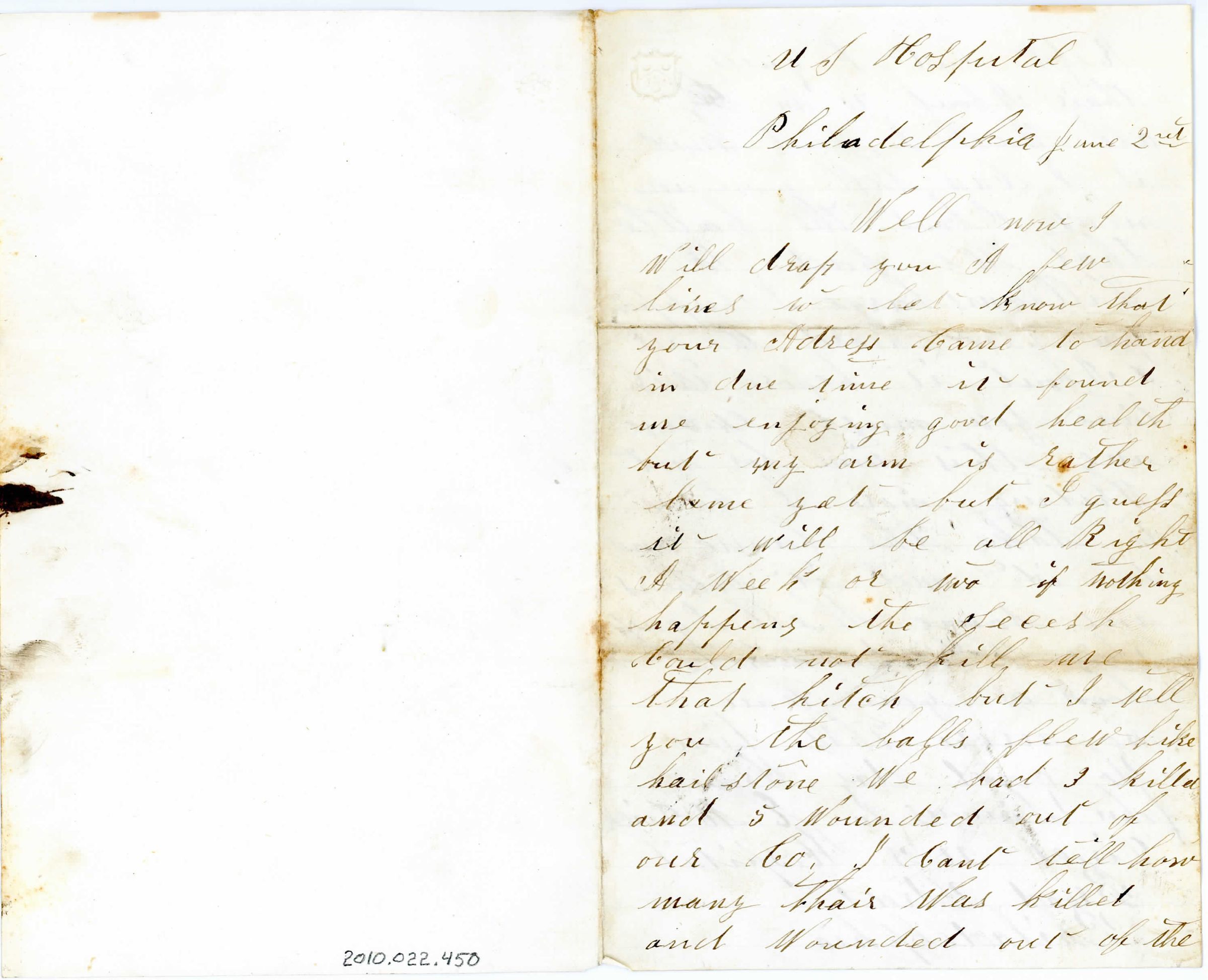 Single page letter folded in half with correspondence on page one and two, three and four are blank. The letter is addressed to "US Hospital, Philadelphia, June 2nd" and signed "So good day from John Simons to E M Dick".