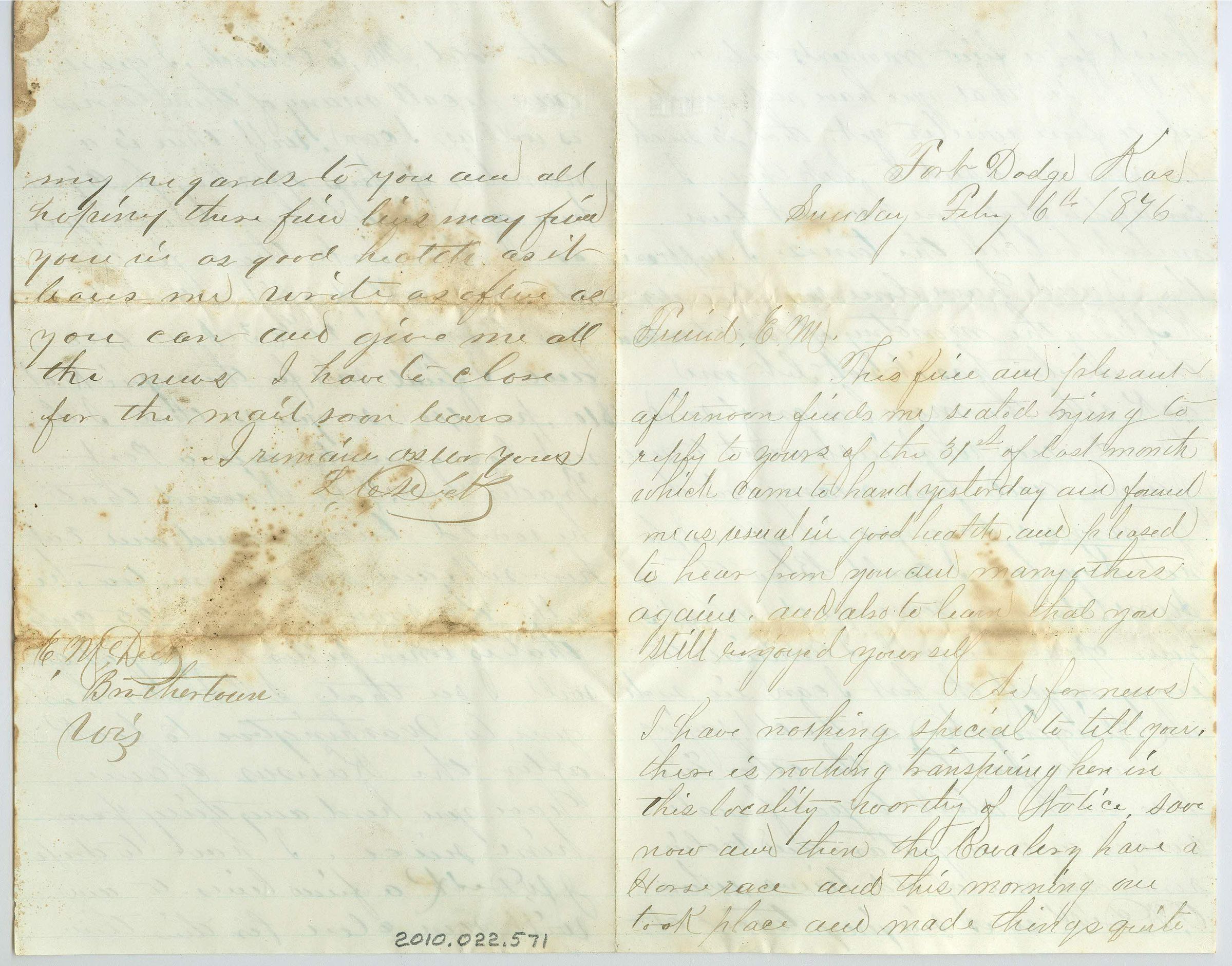 Four pages of correspondence on a single sheet of folded, lined paper. The letter is addressed "Fort Dodge Kas, Sunday Feby 6th 1876, Friend E.M." and is signed on the fourth page (opposite the first page) "I remain -- yours, L.C. Dick". Near the bottom left corner of the last page "E.M. Dick, Brothertown, Wis." is written. Difficult to read for content.Collection