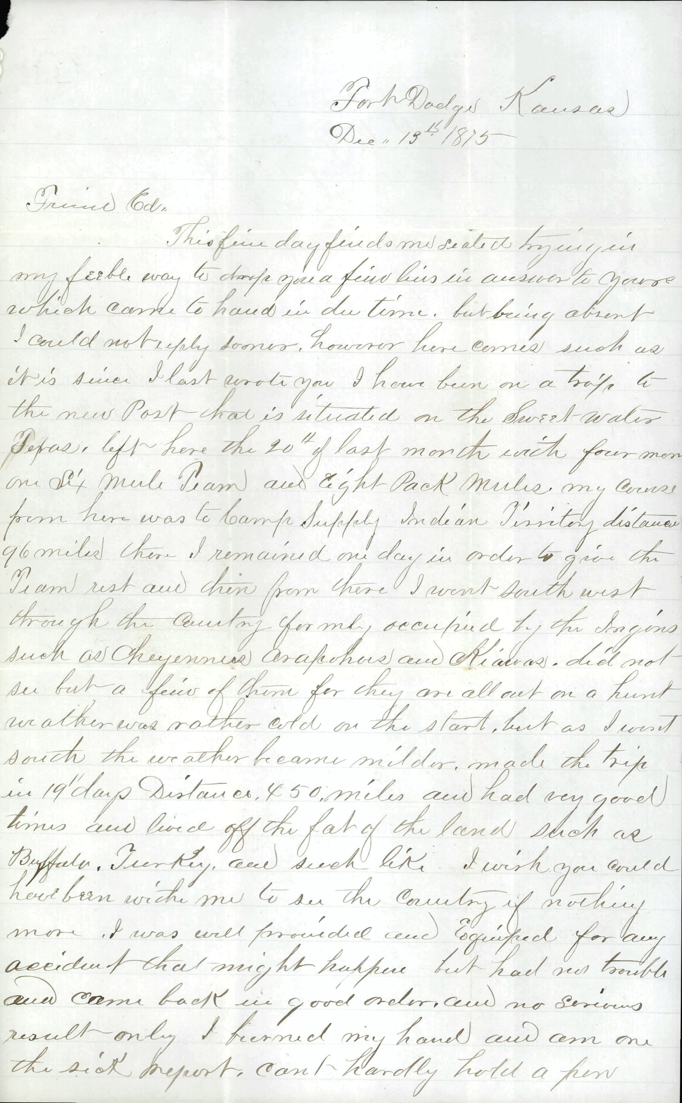 Two page correspondence on a single page of legal paper, lined. The letter is addressed "Fort Dodge Kansas, Dec 13th 1875, Friend Ed." There is a stamp in the top left corner of the first page of the capitol building and "CONGRESS" over the top of it. The letter is signed "Yours truly, L. Dick" and in the bottom left corner of the back page "E.M. Dick, Brothertown Wis".Collection
