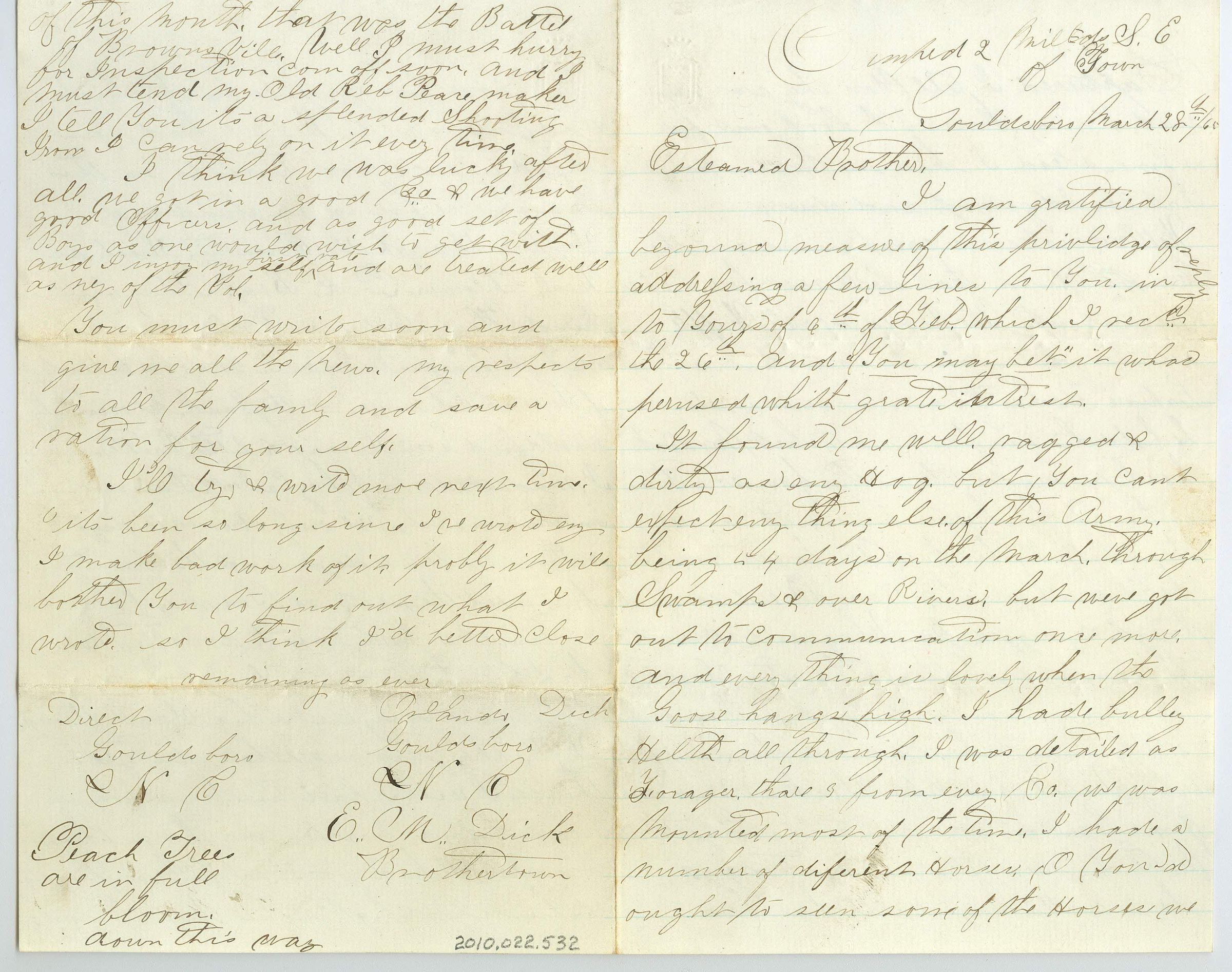 Four pages of correspondence on a single sheet of folded paper. The letter is addressed "Camped 2 Mile S.E. of Town, Gouldsboro March 28th /65, Esteamed [sic] Brother" and signed on the fourth page "remaining as ever, Orlando Dick, Gouldsboro, N.C., E.M. Dick, Brothertown. Direct Couldsboro, N.C., Peach trees are in full bloom, down this way". The army is four days on the march so are ragged and tired. They marched a lot but didn't fight until March 21st and 22nd which was the Battle of Brownsville.Collection