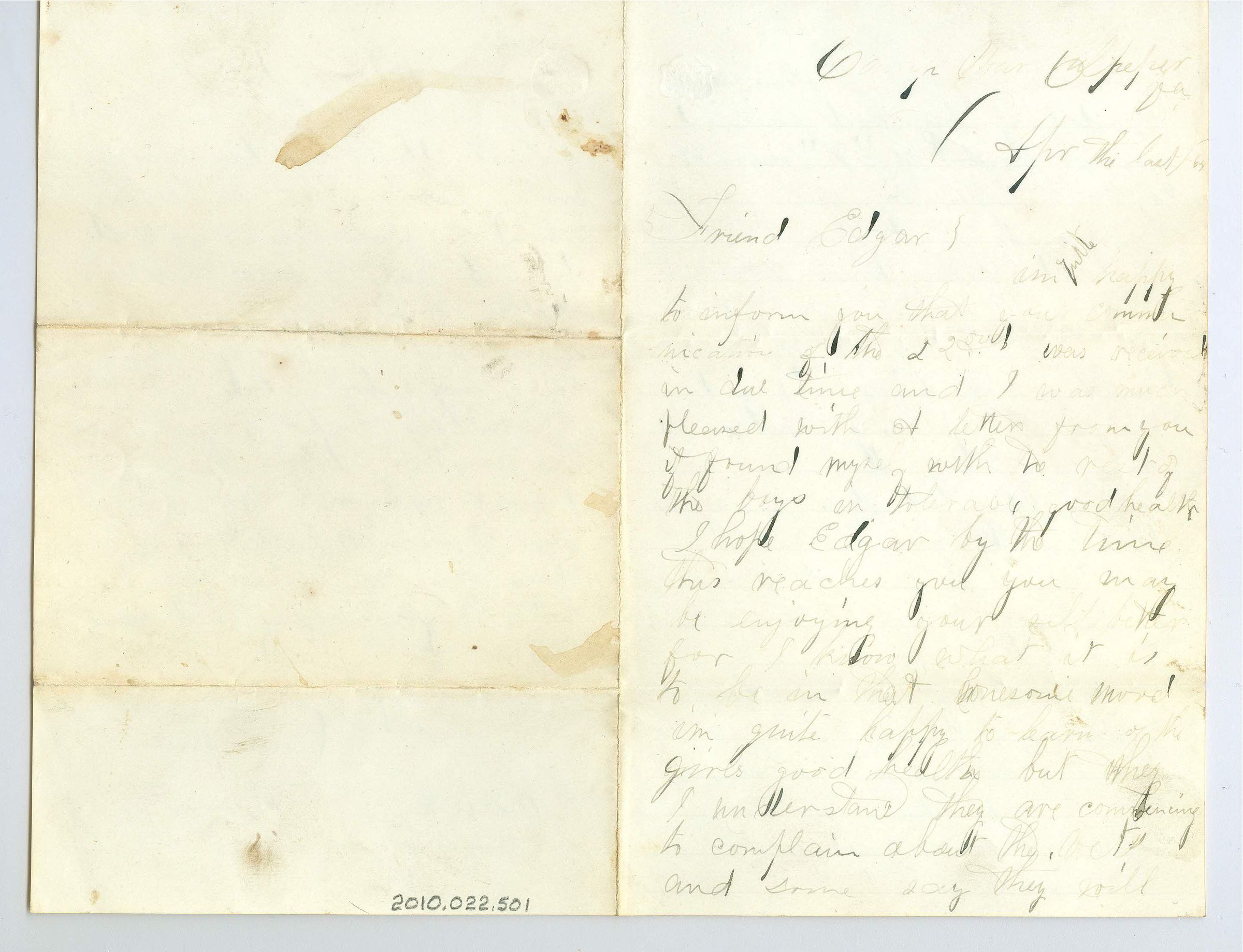 Single sheet of paper folded in half to create four pages of correspondence (last page, opposite first page, is blank). The letter is addressed "Camp near -- Va, Apr the last /64. Friend Edgar" and is signed "Respt I am, Oscar Johnson, Washington DC, E M Dick, Brothertown, Wis". Faint blue lines on the first page only. Writing in black ink, but it is thin and fading in many spots making it hard to read.Collection