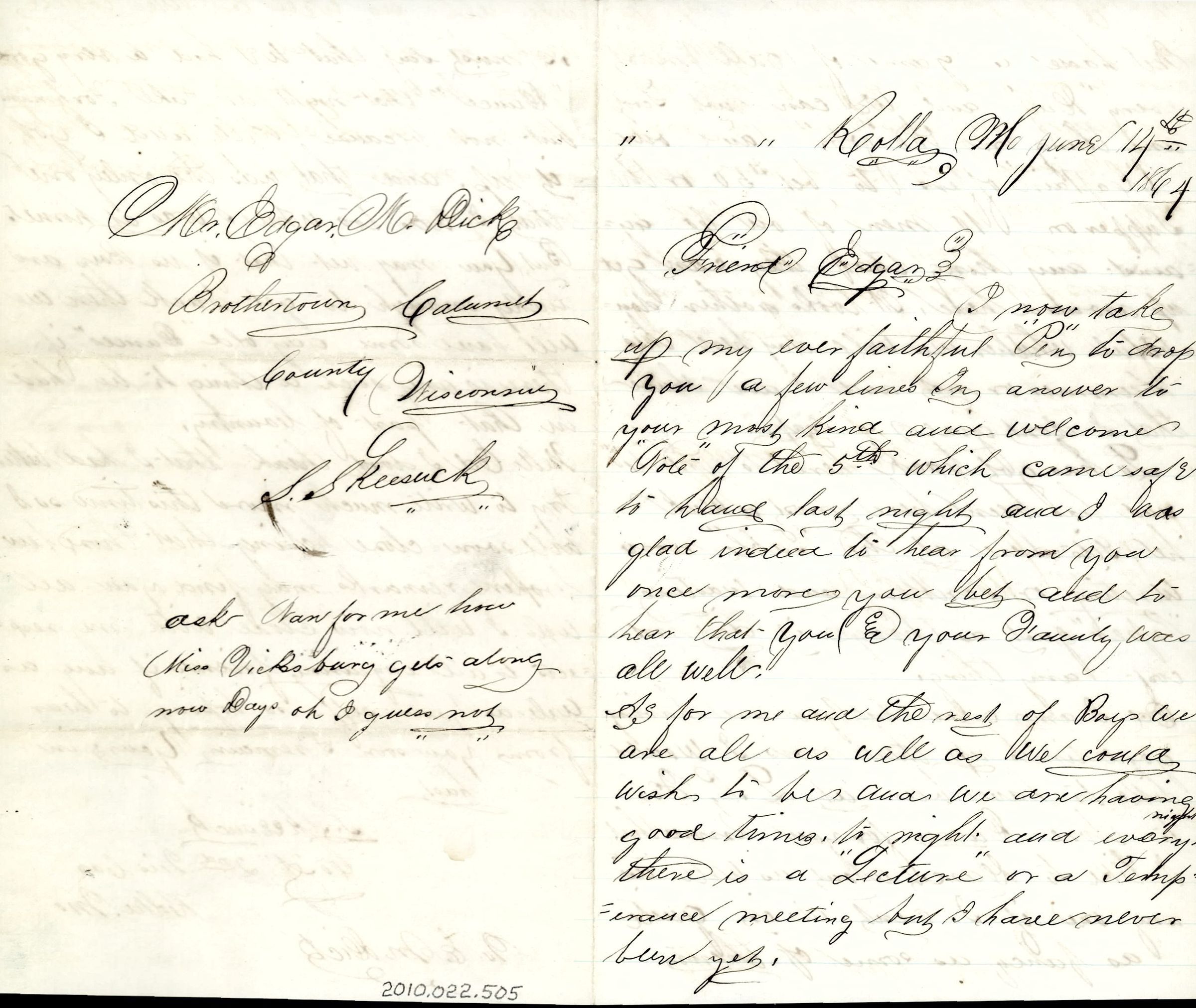 Four pages of correspondence on a single sheet of folded paper. Blue lines only on the first page. The letter is written in black ink. It is addressed "Rolla Mo. June 14th 1864, Friend Edgar" and is signed on the last page (opposite first page) "Mr. Edgar M. Dick, Brothertown Calumet County, Wisconsin, S. Skeesuck, ask Sam for me how Miss Vicksburg gets along now Days oh I guess not". There is also a signature on the bottom of the third page that reads "I remain yours in hash, S. Skeesuck, Co A 2nd Wis Cav, Rolla Mo. To E. M. Dick". The soldiers are as well as can be and even play ball every day and try to have a dance.Collection