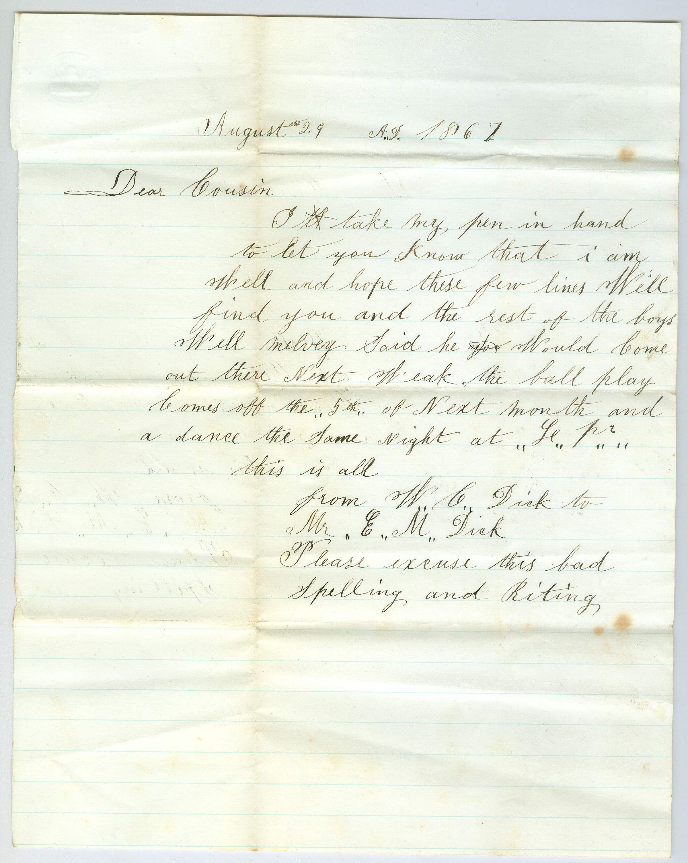 Single sheet of paper with writing on just one side. The letter starts "August 29 A.D. 1867, Dear Cousin". The letter is short saying the writer is well, Melvey is coming next week, and there is a ball game and a dance they are looking forward too. It is signed "this is all, from W. C. Dick to MR E.M. Dick, Please excuse this bad spelling and riting [sic]".Collection