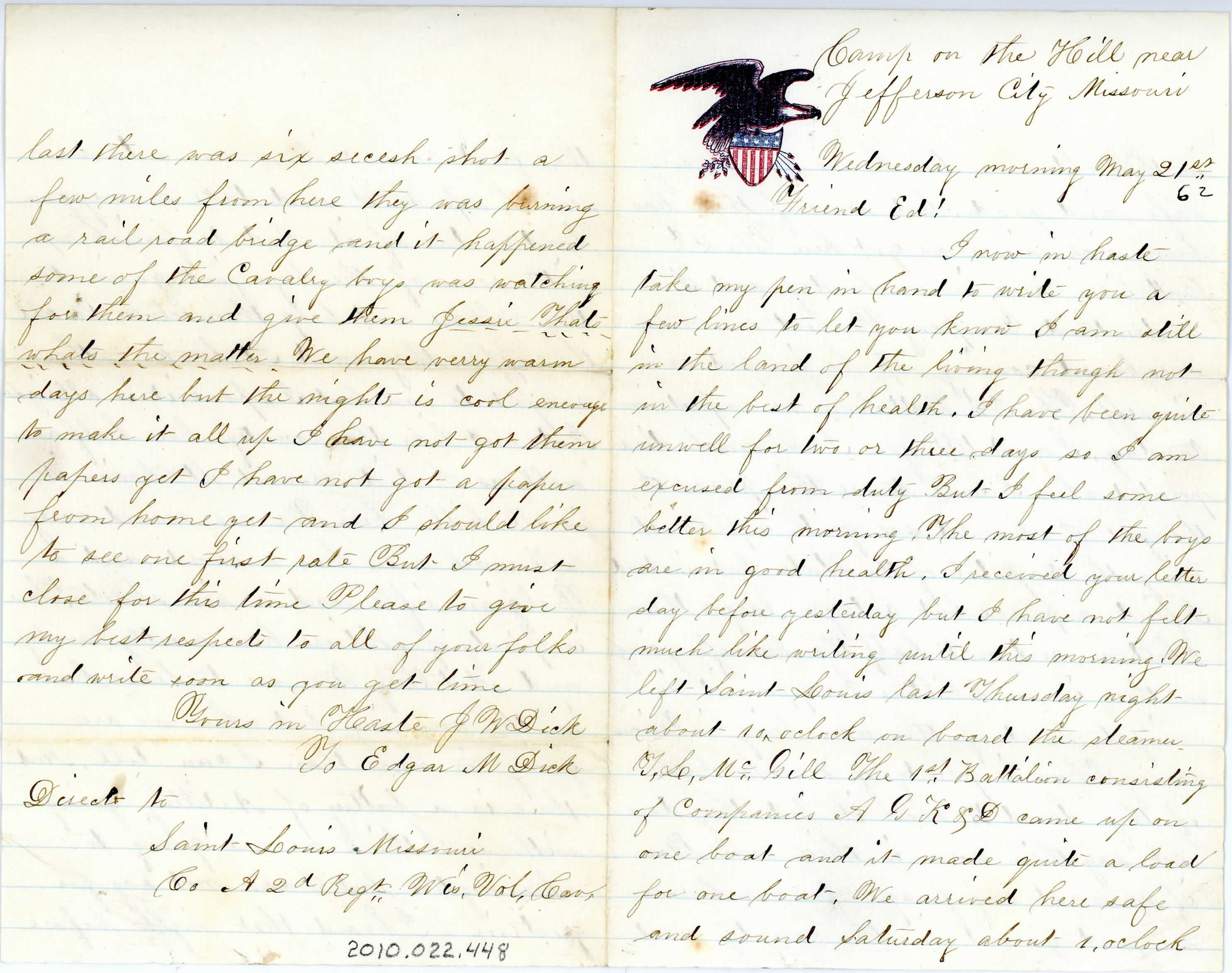 Four page letter on a single sheet of paper with a red, black, and blue eagle on top of a shield stamped in the top left corner of the first page. Peaking out from behind the shield are arrows to the right and branches to the left. The letter is addressed "Camp on the Hill near Jefferson City, Missouri. Wednesday morning May 21st 62. Friend Ed!" and is signed "Yours in Haste J. W. Dick to Edgar M. Dick. Direct to Saint Louis Missouri Co A 2nd Regt Wes. Vol. Cav". Talks about arriving in Jefferson City. It talks about how few people populate the city because most of the men are in the other army, but there are still "plenty of secesh here".Collection