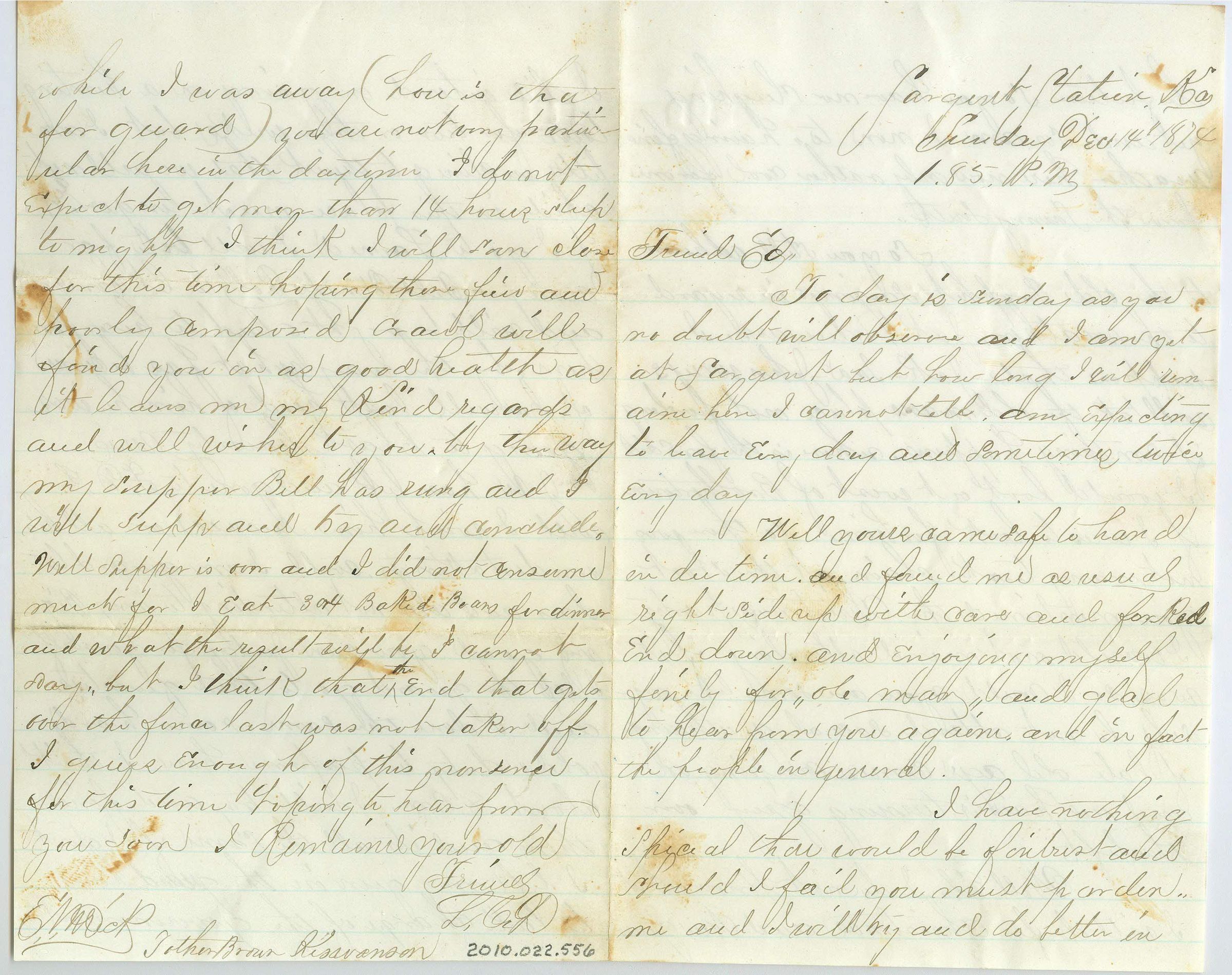 Four page correspondence on a single folded piece of paper. The letter is addressed "Sargent Station, Ka, Sunday Dec 14 1874, 1.85.W.M., Friend Ed" and is signed on the fourth page (opposite the first page) "I remain yours old Friend, L.C.D".Collection