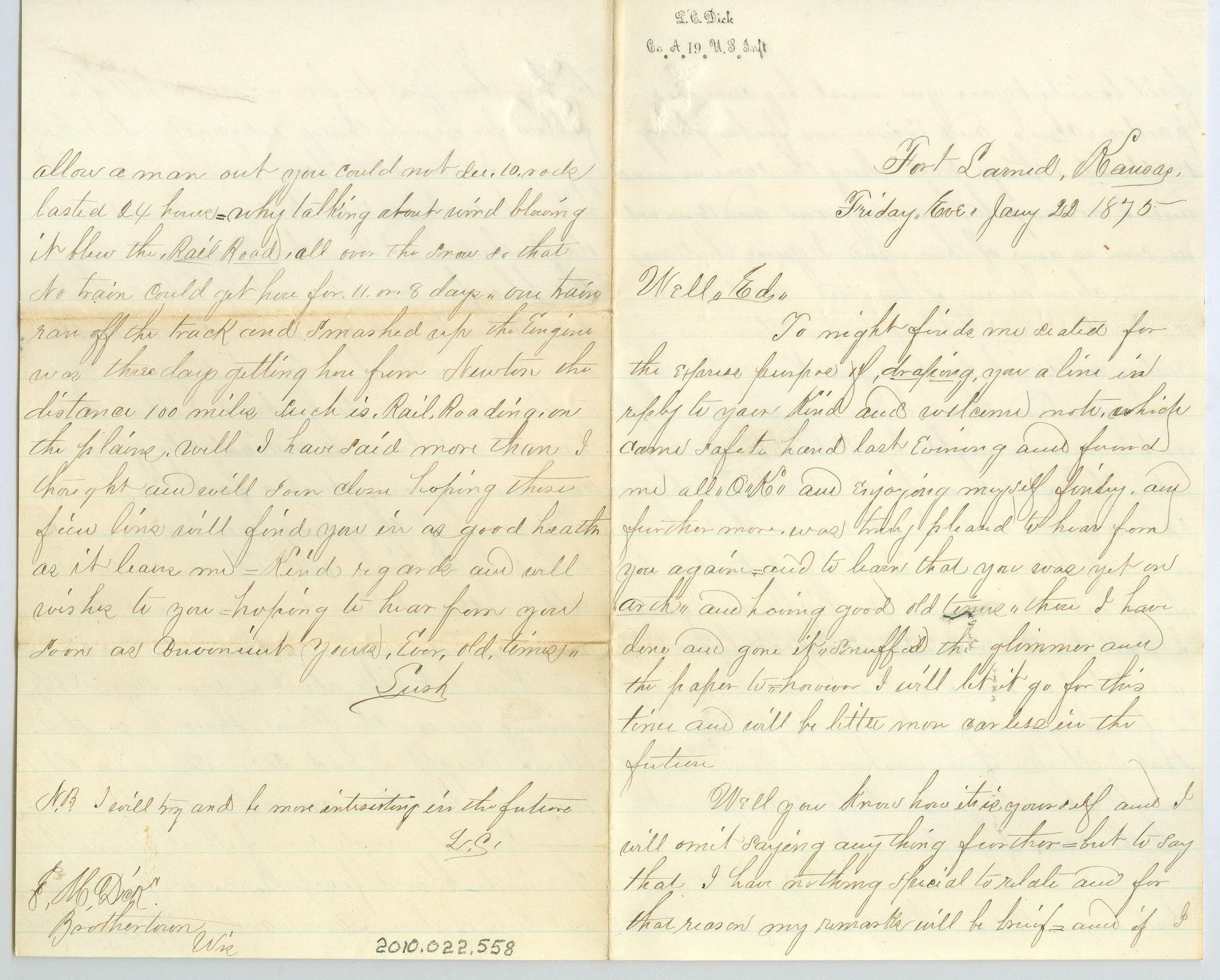 Four page correspondence on a single sheet of folded paper. The letter starts "Fort Larned, Kansas, Friday Eve, Jany 22 1875, Well Ed". There is a stamp in the top left corner of the first page that reads "L.C. Dick, Co. A. 19. U.S. Inft". The letter is signed "Your, Ever, Old, Timer, Leesh. N.B. I will try and by more interesting in the future. L.S." Difficult to read for content.Collection