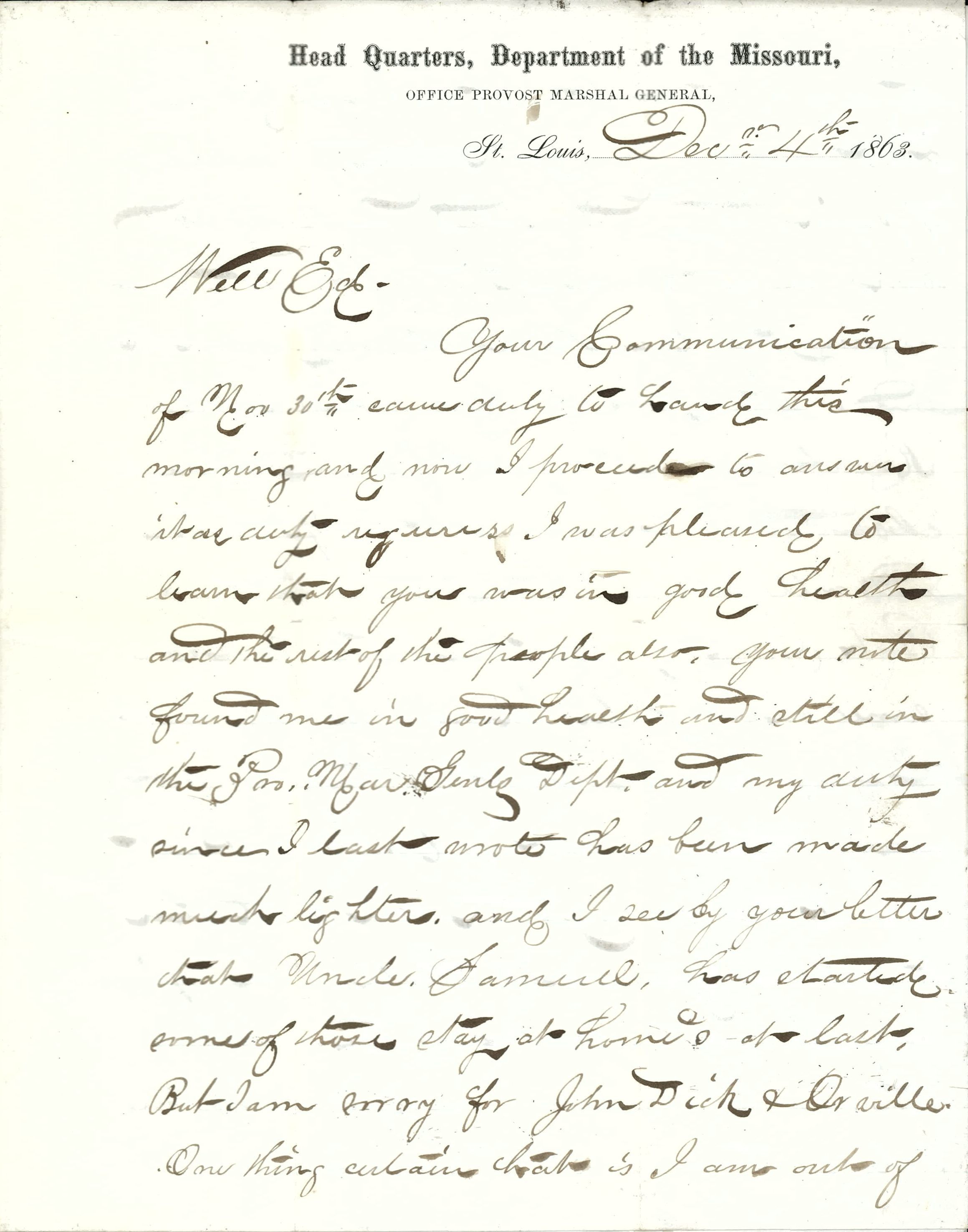 Full sheets of paper create a four page letter. The first page has a stamp at the top that reads "Head Quarters, Department of the Missouri, Office Provost Marshal General, St. Louis Dec. 4th 1863" and is addressed to "Well Ed" and signed "LMJ" (Loren M. Johnson). Writing is difficult to read.Collection