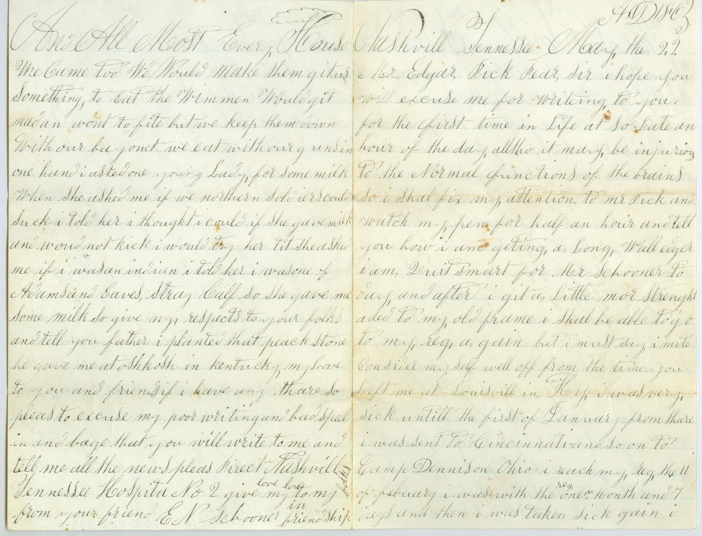 Single sheet of paper folded in half to create four pages of correspondence. First page addressed " Nashvill Tennessee, May the 22 AD 1863, Mr. Edgar Dick, Dear Sir" and signed "tell me all the news pleas Direct Nashvill Tennessee Hospital No 2. Give love to my folks, from your friend EN Schooner in friendship". The contents talk about his transfer to the hospital, fighting the war, getting food from the farms they come across. The letter was folded in thirds as well.