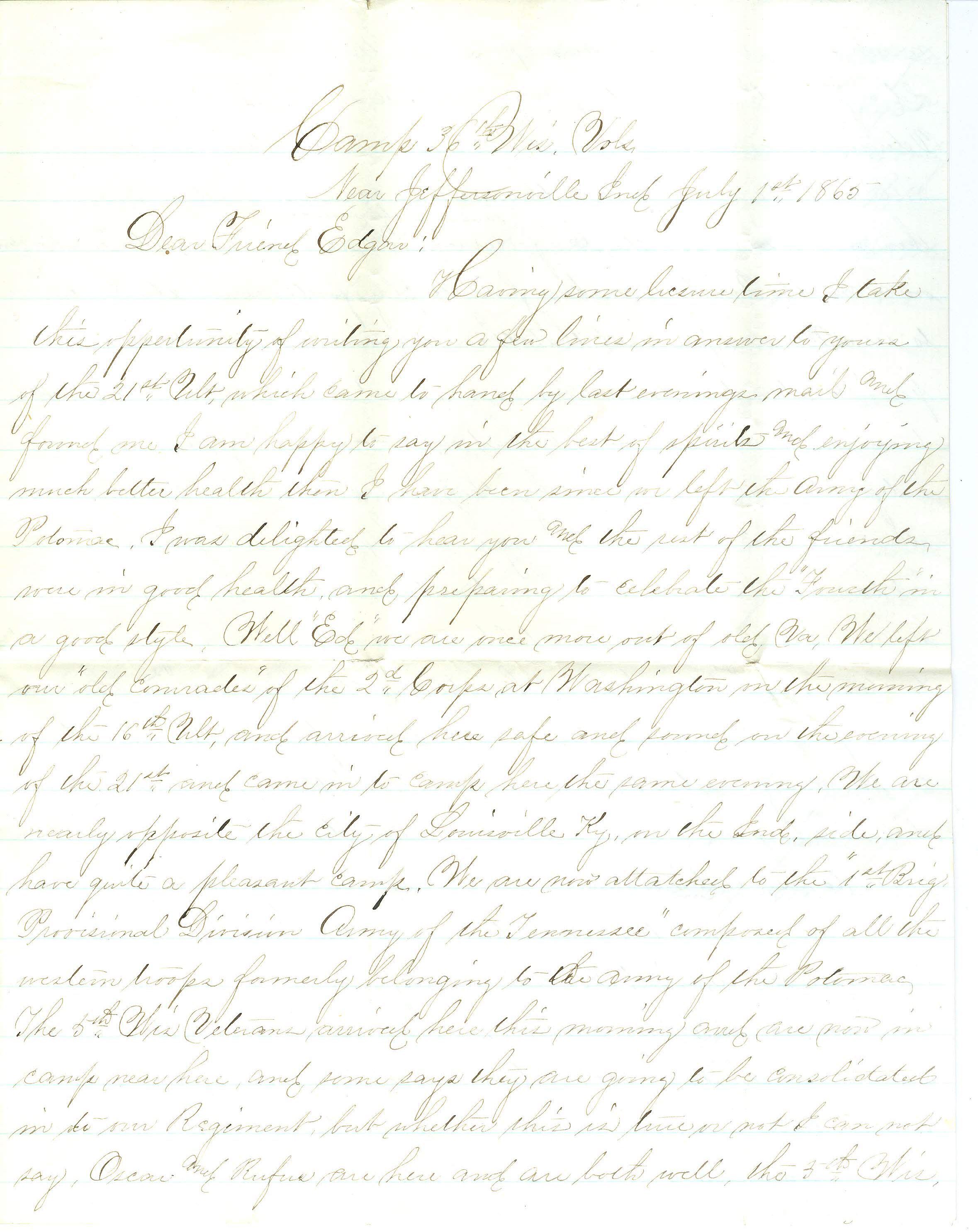 Four page correspondence on two connected pieces of paper. The fourth page is blank, only writing on first three pages. The letter is addressed "Camp 36th Wis. Vols., Near Jeffersonville Ind, July 1st 1865, Dear Friend Edgar:". It is signed on the third page "I am Verry [sic]Respectfully, Your Obedient Servant, John W. Dick, Co G 36th Wis Vols., 1st Brigade Provisional Division, Army of the Tennessee, Louisville Ky." The writing is thin and in a gray/black ink. The letter is to Edgar W. Dick, Brothertown Calumet Co, Wisconsin and this is faded to the left of the signature on the third page.Collection