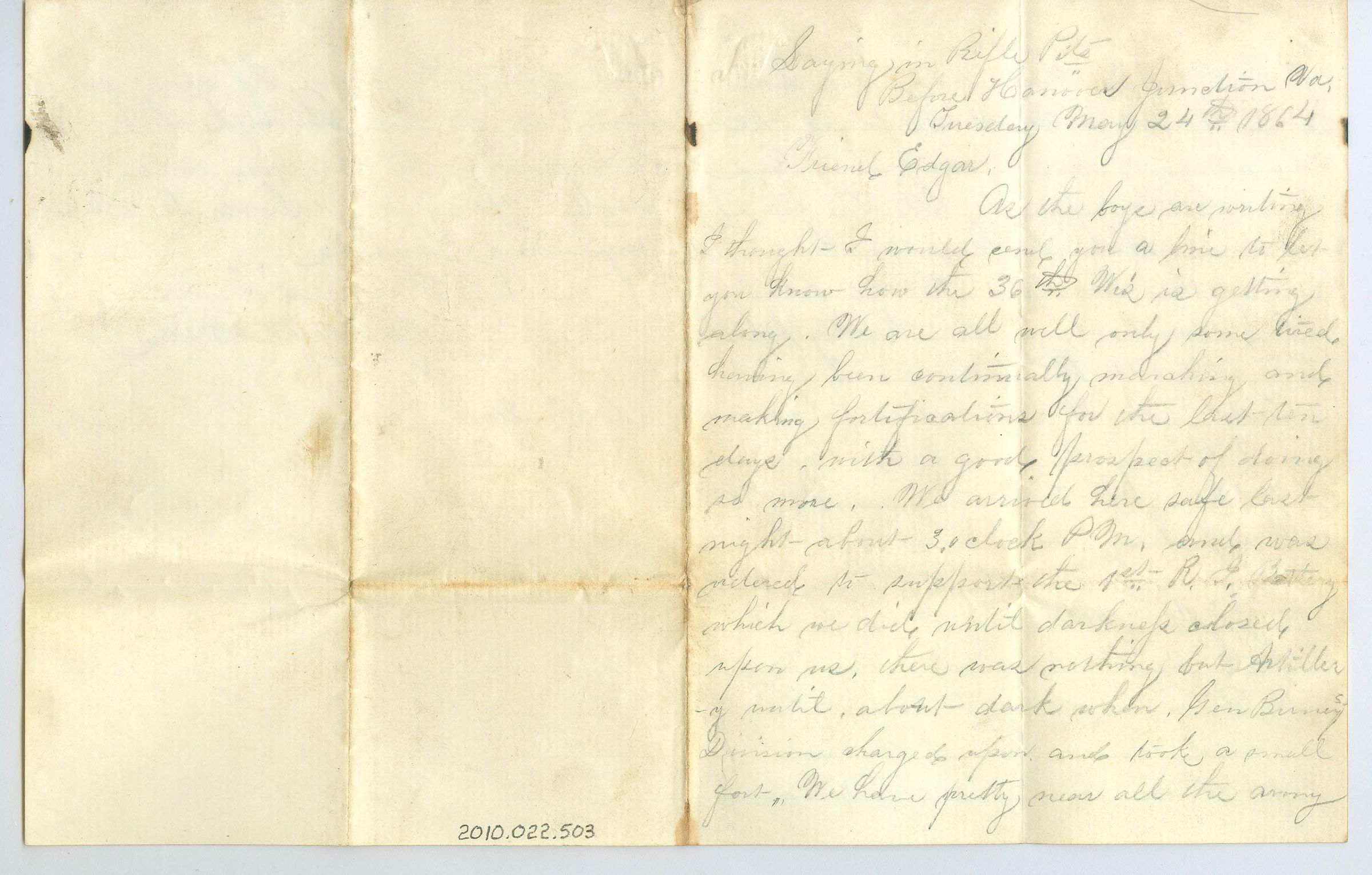 Four pages of correspondence on a single sheet of paper folded in half. The last page (opposite first page of writing) is blank. The letter is addressed "Saying in Rifle Pile, Before Hanover Junction Va., Tuesday May 24th 1864, Friend Edgar" and is signed "I am as ever, John W. Dick, to E. Dick". The letter is written in pencil. There is a stamp in the top left corner of the first page that left an impression on the last page, top right corner (mirroring each other in the middle of the unfolded sheet). The stamp looks like a scroll with an arrow through the top wound portion of the scroll. The letter is about how the boys have been marching and making fortifications for the last 10 days so they are well but tired. It talks about how hot it is in VA and they are just waiting to be called to fight against Gen. Lee.Collection