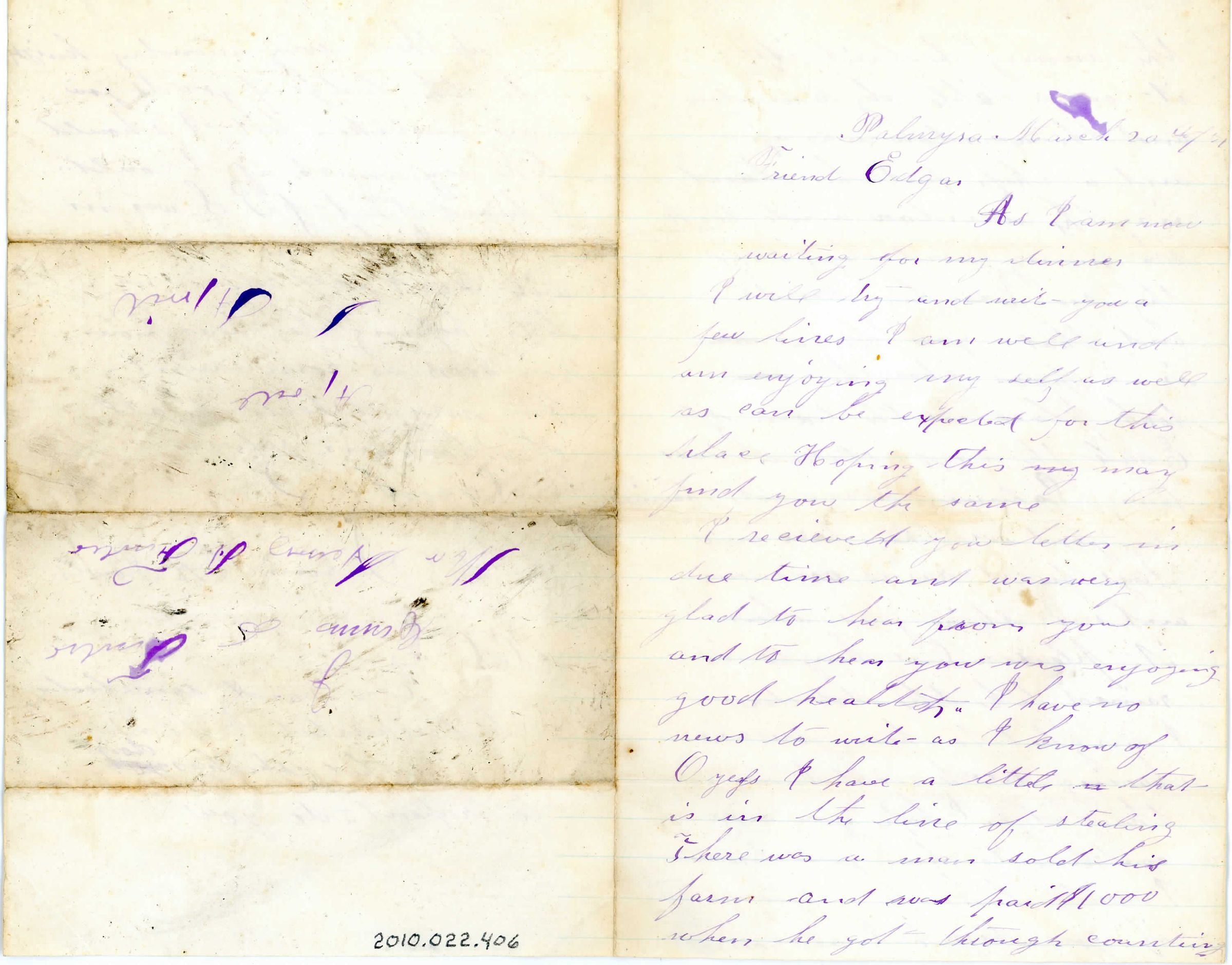 One page folded in half to create four pages to this letter. On the left side of the front half is what looks like the address to send it to Mr. Henry Fowler, it is written upside down from the first page of content. The letter is written in blue ink and starts "Palmyra, March 20th, Friend Edgar. It talks about a man who just sold his farm and when he finished counting his money, someone stole it through the open window. He asks to come visit him at the lodge on Monday. Signed H.A. Fowler. It has a P.S. asking about why someone repented.Collection