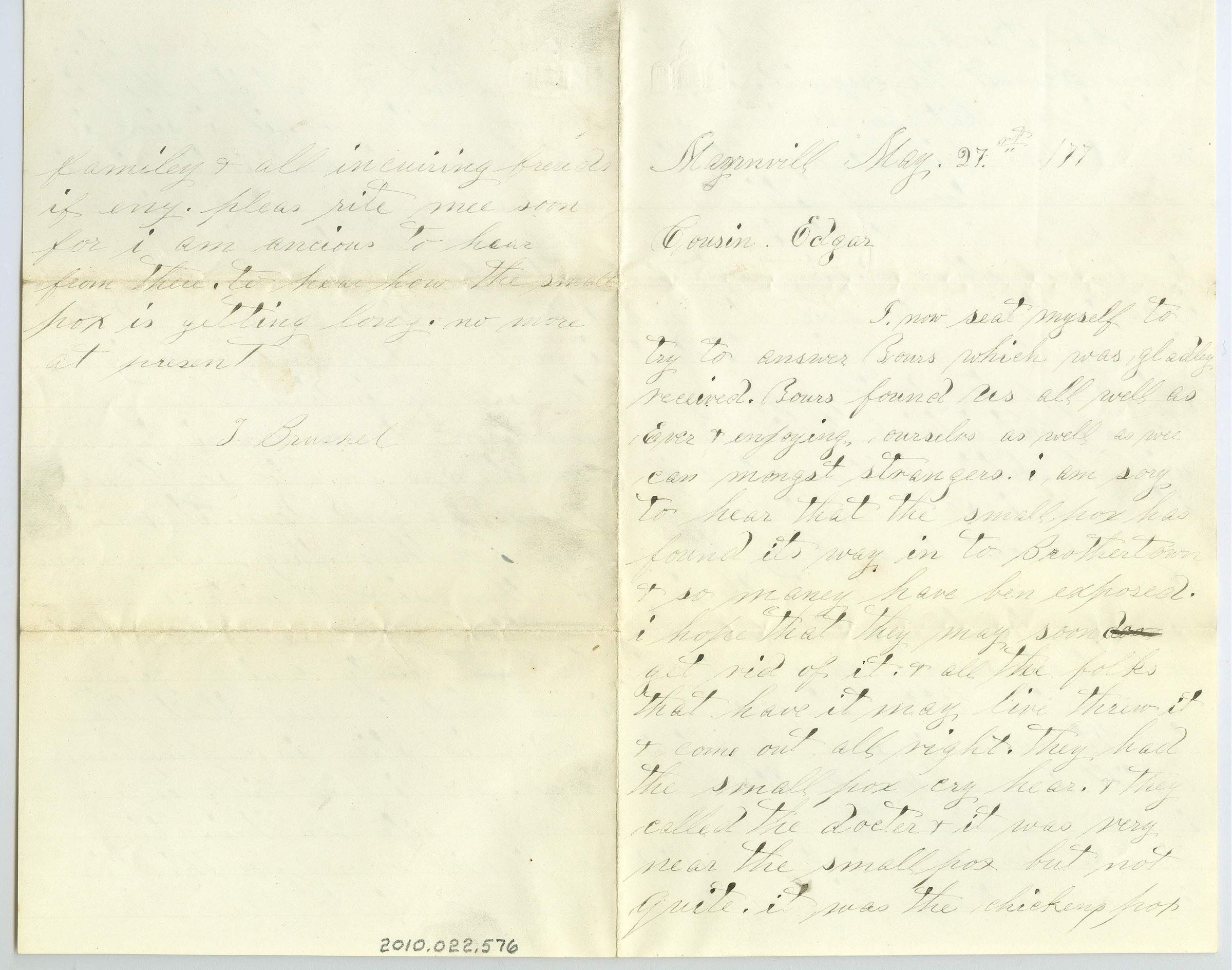 Four page correspondence written on a single sheet of folded paper. The letter is addressed "Maryvill, May 27th /77, Cousin Edgar" and is signed on the fourth page (opposite first page) "J. Brushel". The handwriting is heavy at the top of letters making it look like the page is dotted. The writing is fading and hard to read for content.Collection