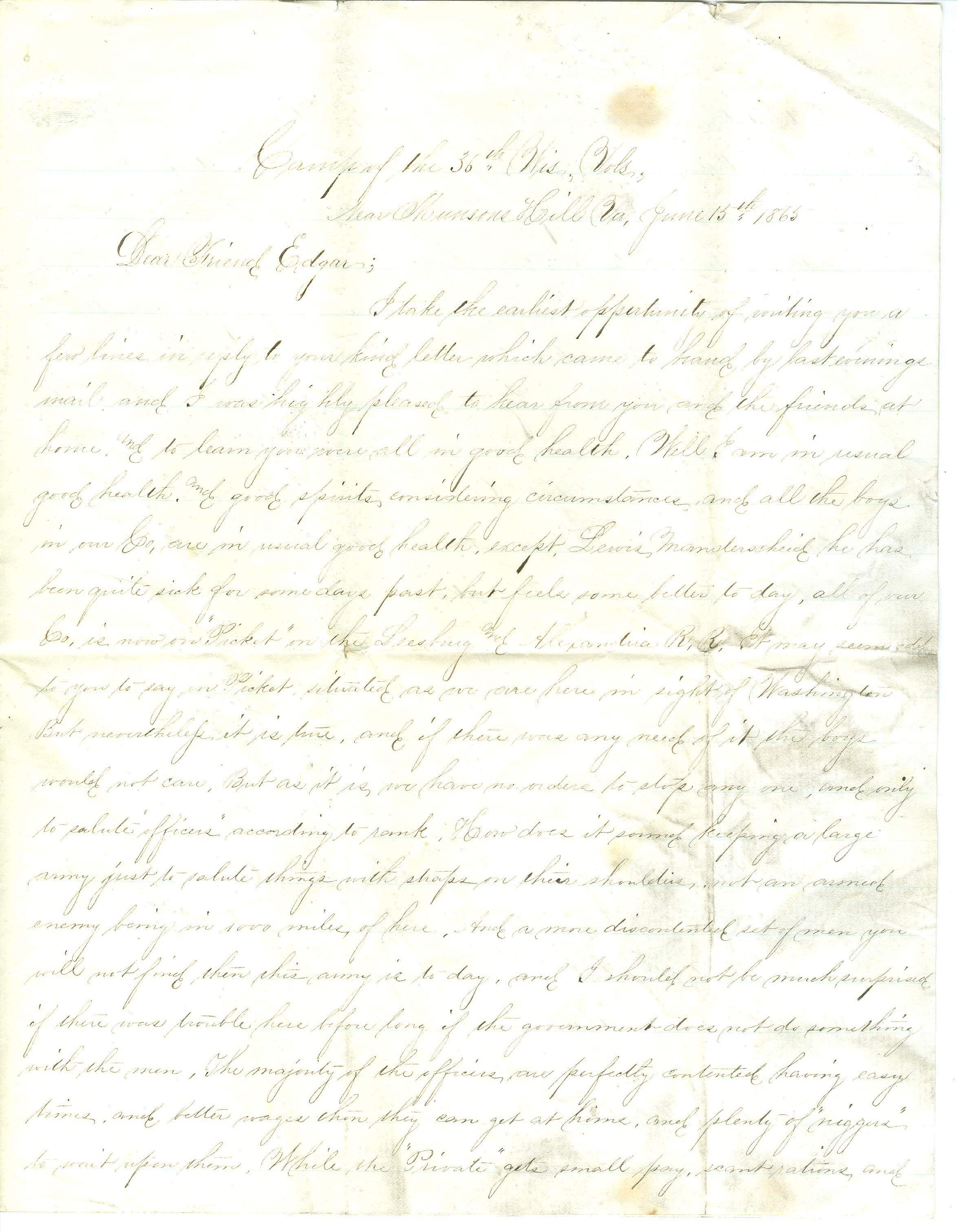 Four page letter written on two pieces of connected paper. The letter is addressed "Camp of the 36th Wis. Vols, Near Munsee Hill, Va, June 15th 1865, Dear Friend Edgar;" and is signed on the third page "Ever your Sincere Friend, John W. Dick". The fourth page is blank. The writing is faint and the ink is a faint gray color.Collection