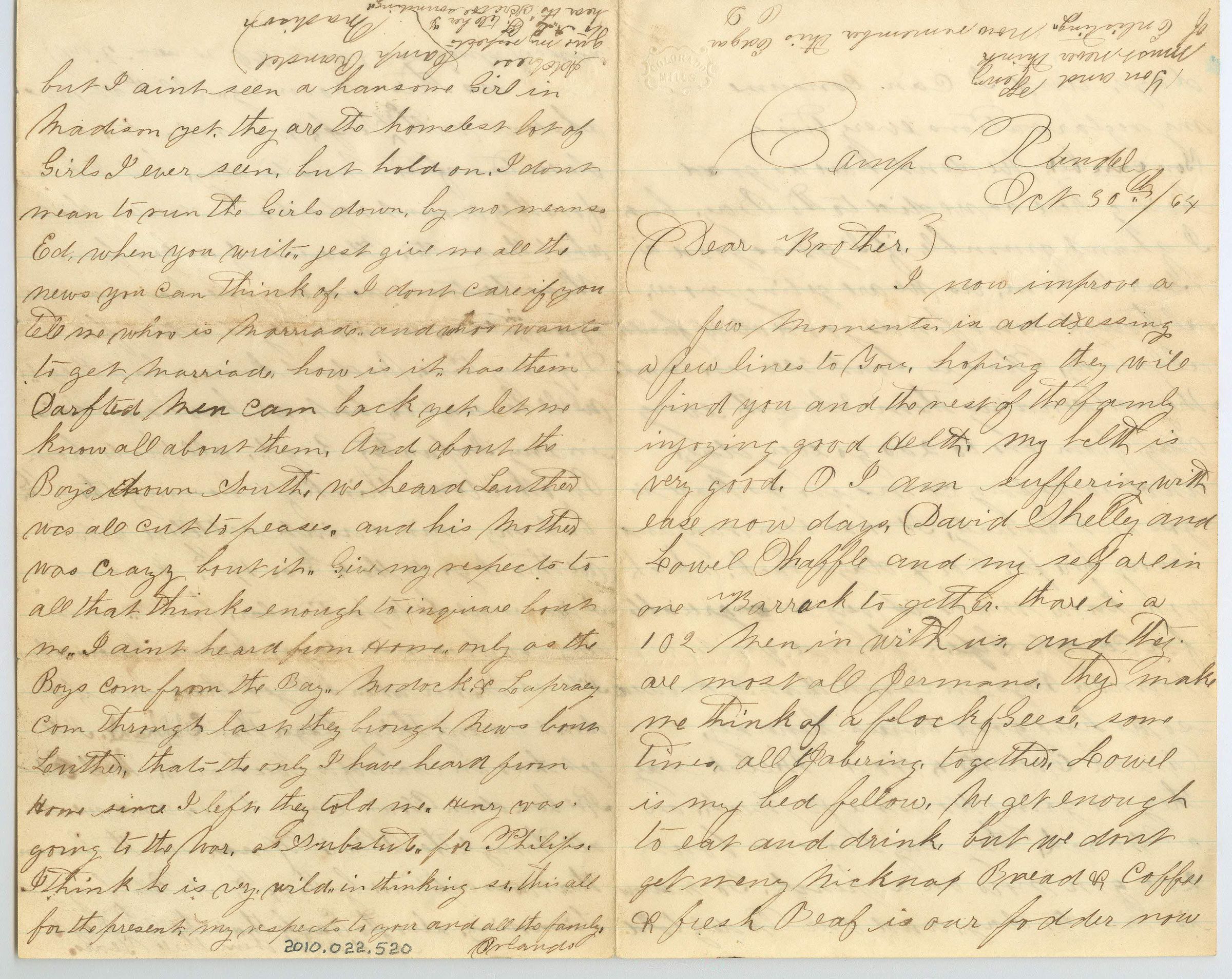 Four pages of correspondence on a single sheet of folded paper. The writing goes to every edge of the paper. The letter is addressed "Camp Randel, Oct 30 / 64, Dear Brother". Written above the address, upside down, is "You and Henry must never think of enlisting now, remember this Edgar, OD". It is signed at the very bottom of page four "My respects to you and all the family, Orlando." Written upside down on the top of the fourth page is "ADress Camp Randel, Madison, give my respects to A.L.F. tell her I hear the scri-- sounding".Collection