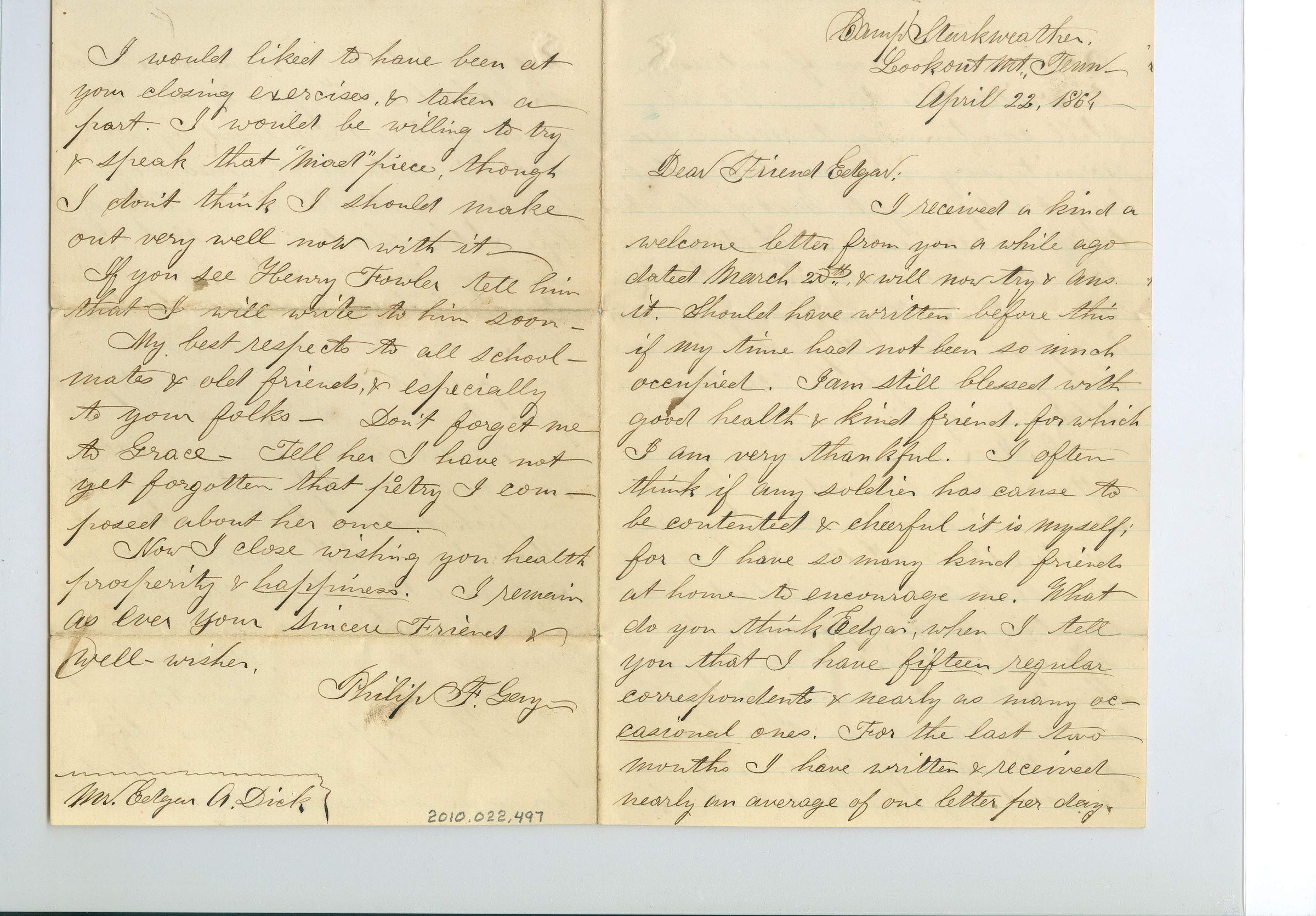 Four pages of correspondence on a single folded sheet of paper. It is written in a black ink and is addressed "Camp Starkweather, Lookout Mt. Tenn. April 22, 1864. Dear Friend Edgar" (Edgar Dick) and is signed "Philip F. Gery". He talks about all the people writing him and how his company is still receiving new recruits. He regrets that Edgar will never be able to "soldier" again because of his health and that his brother Asa has died. It sounds like he died in battle "for the cause of right".Collection