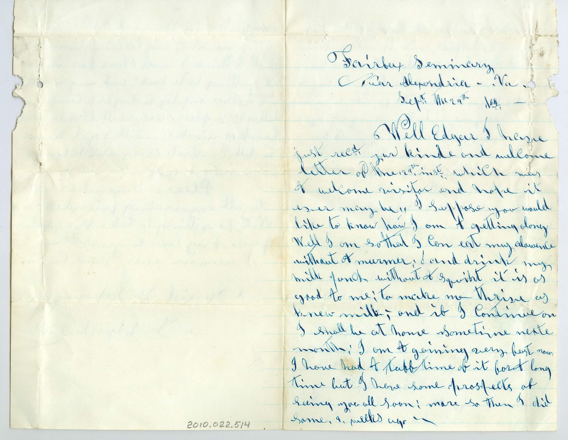 Three pages of correspondence on a single sheet of paper folded in half (fourth page is blank). The letter is written in blue ink and addressed "Fairfax Seminary, near Alexandria, Va. Sept the 24th /64. Well Edgar". The signature on the third page reads "I remain ever Dear Cousin, Daniel S. P--" (can't make out last name) "To Edgar M. Dick". The writer must have been hurt and is on the mend and claims he will return home soon. He received news from the recipient of a number of deaths and mourns them but says "so it is and so it must be". He says there is good news from the south that the northern army is gaining ground.Collection