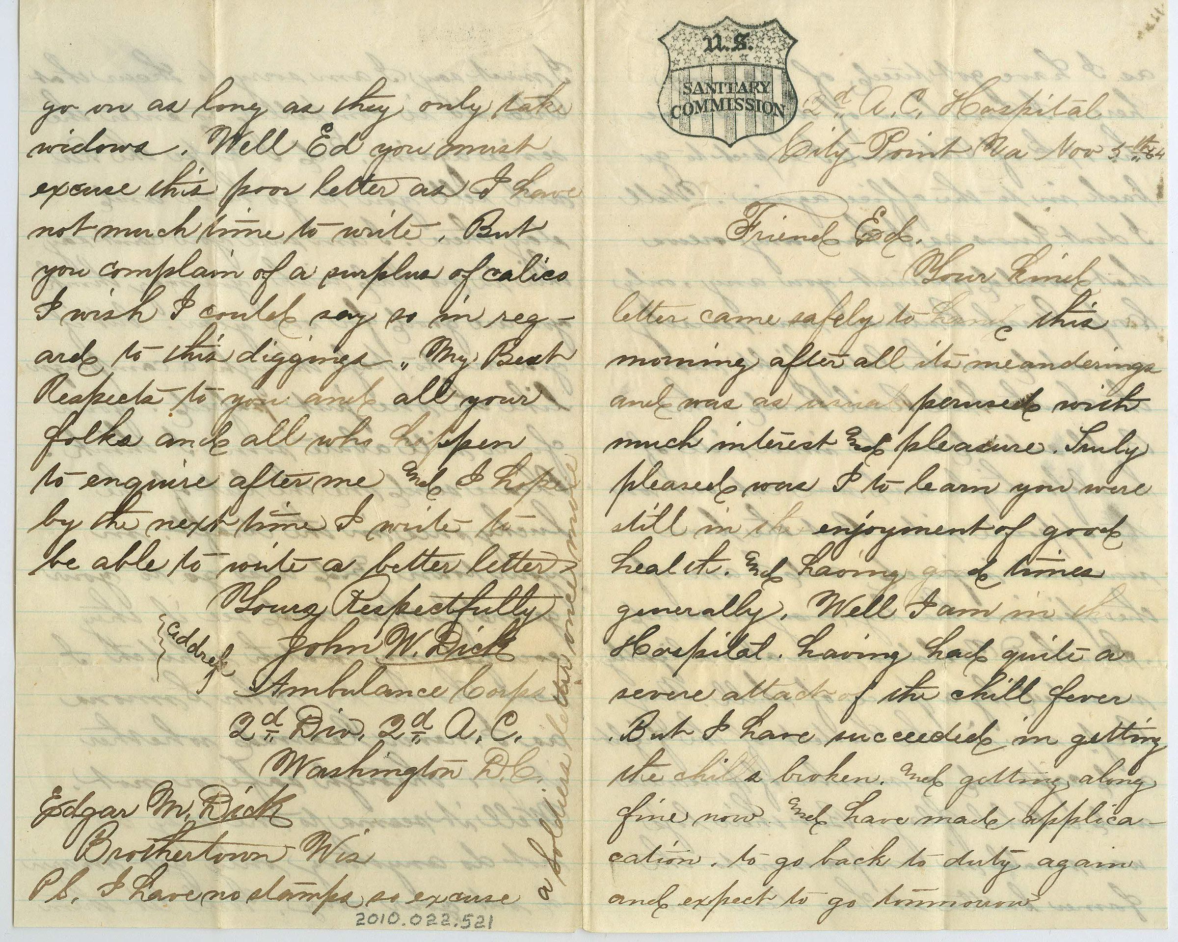 Four page correspondence on a single sheet of folded paper. In the top left corner of the first page is a stamp that reads "U.S. Sanitary Commission" in a shield that has the same design as the American flag. The letter is addressed "2d A.C. Hospital, City Point, Va, Nov 5th 64. Friend Ed" and signed on the fourth page "Yours Respectfully, John W. Dick, Ambulance Corps, 2nd Div, 2nd A.C., Washington D.C., Edgar M. Dick, Brothertown Wis. PS. I have no stamps so excuse a soldiers letter once more" and the last few words of the PS are written up the right edge of the last page. It talks about capturing prisoners and a rebel flag; asks about Edgar's fever; and asks who has recently been drafted from Brothertown.Collection