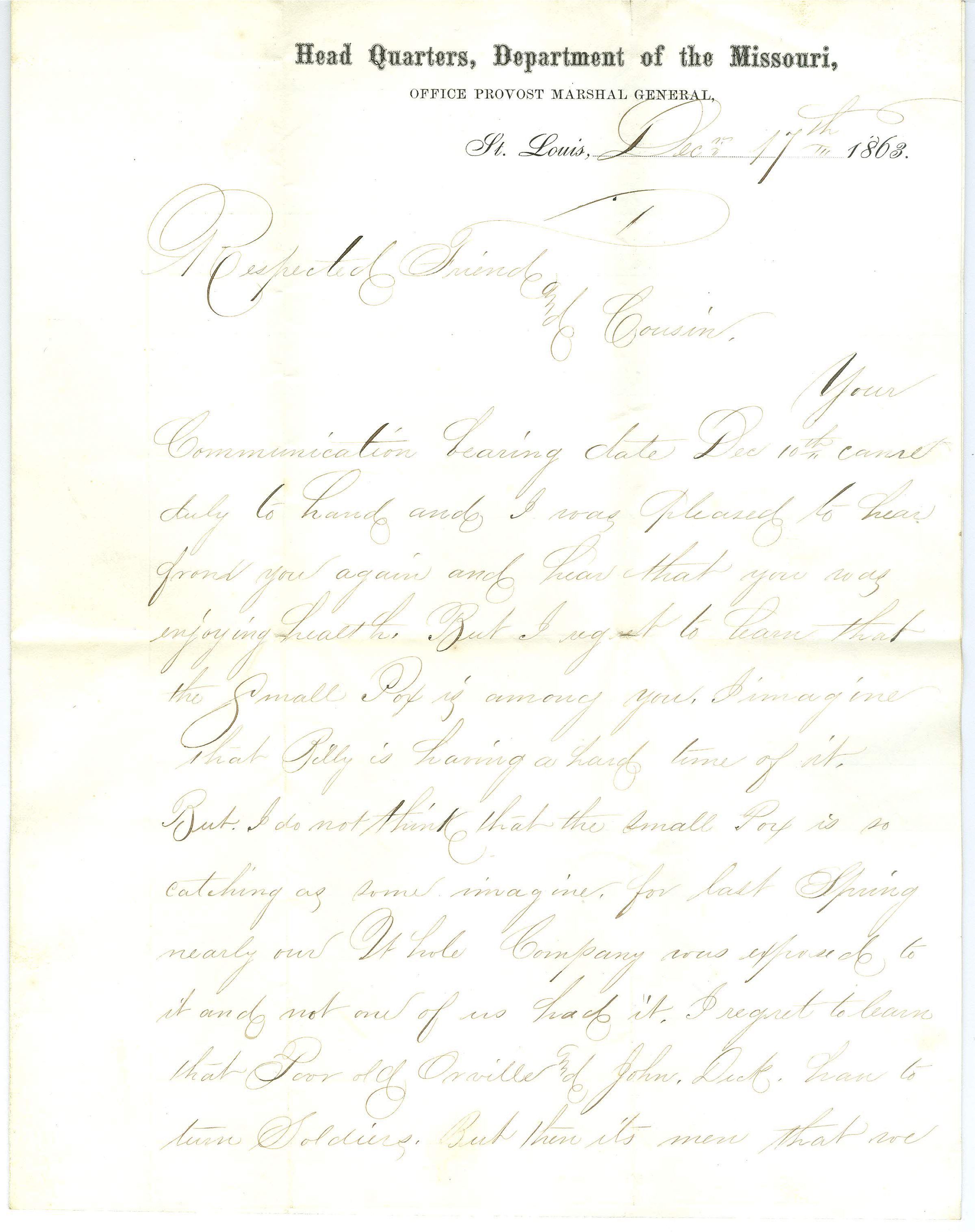 Four full page correspondence on letter head paper. Letter head reads "Head Quarters, Department of the Missouri, Office Provost Marshal General, St. Louis. Dec. 17th 1863" and is addressed to "Respected Friend and Cousin," signed "Friend and Cousin Loren M. Johnson". It is written to Edgar M. Dick, Brothertown, Wisconsin. The company was exposed to small pox.Collection