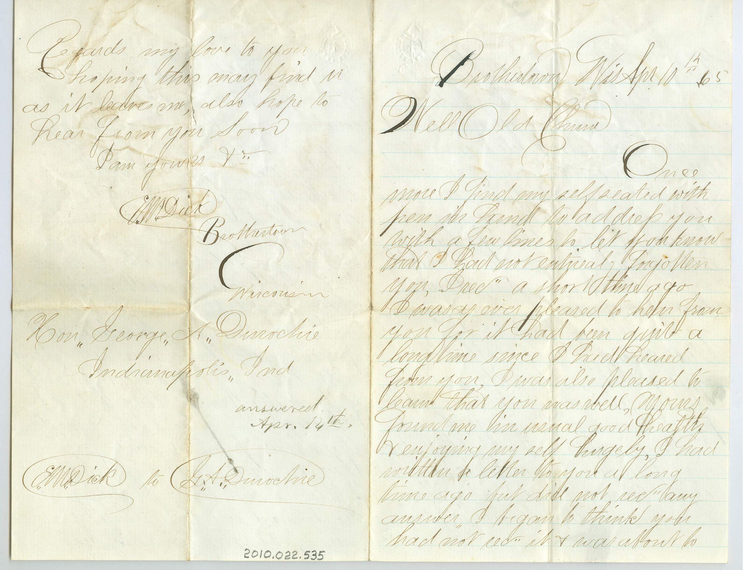 Four pages of correspondence on a single sheet of folded paper. Only the first three pages have blue lines. The letter is addressed "Brothertown Wis. April 10th 65, Well Old Chum" and is signed on the fourth page (opposite the first page) "Regards my love to you, hoping this may find u as it leaves me, also hope to hear from you soon, I am yours --, M. Dick, Brothertown, Wisocnsin. Hon George A. Durochie, Indianapolis, Ind., Answered Apr 14th, EM Dick to GA Durochie".Collection