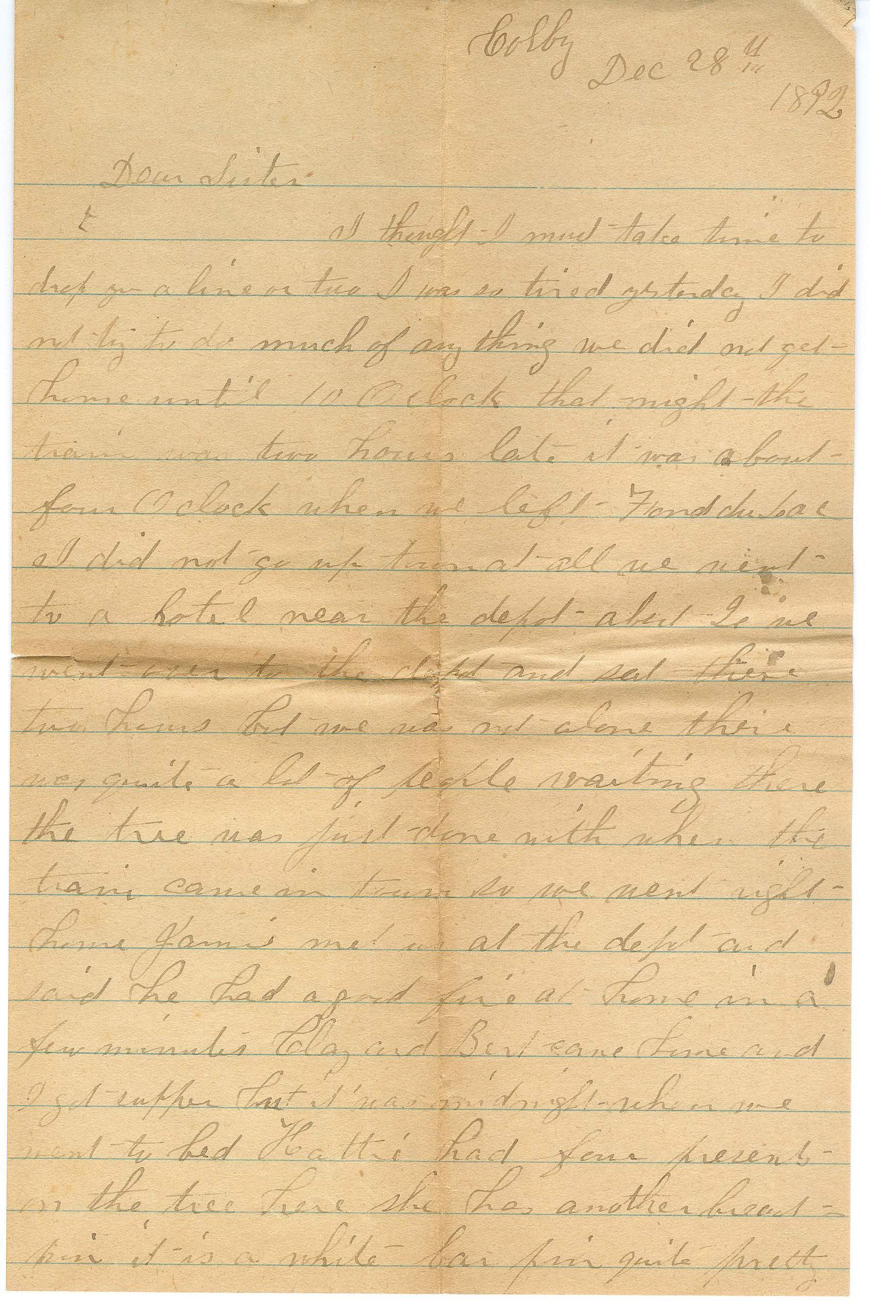 Three sheets of paper used to make four pages of correspondence. Writing is on the first page (BC2010.022.610A) with the address "Colby Dec 28th 1892, Dear Sister". On the back of the same page is the second page of correspondence. On a second sheet of paper located in the same sleeve as the first page is the third page of correspondence, the back of this paper is empty (BC2010.022.610B). A third sheet of paper (BC2010.022.610C) in its own preservation sleeve has writing on one side with the signature "Well, wish you, happy --, regard to all please write all the mens, Jane Johnson" and below the signature along the left edge is "H.L.F." most likely Hattie L. Fowler.Collection