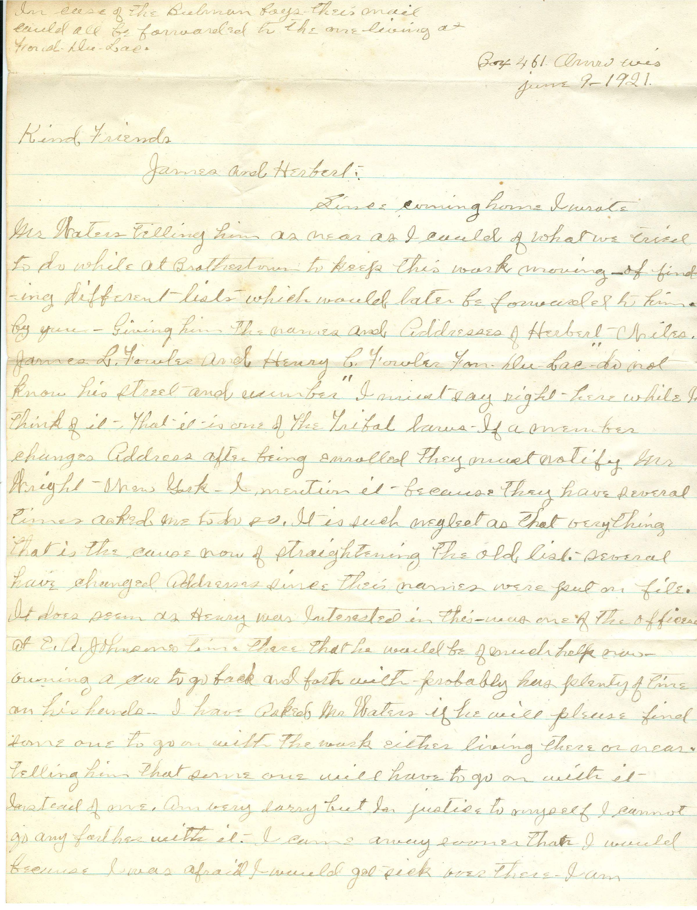 Two page correspondence on a full sheet of lined paper. The letter is addressed "Box 461 Omro Wis, June 9-1921, Kind Friends, James and Herbert". In the top left corner of the first page it reads "In case of the Bulman boys, their mail could all be forwarded to the one living at Fond Du Lac." The second page gets crowded at the bottom as the writer runs out of room and is signed "Sincerely yours, Ellen R. Johnson, Box 461 Omro Wis".Collection