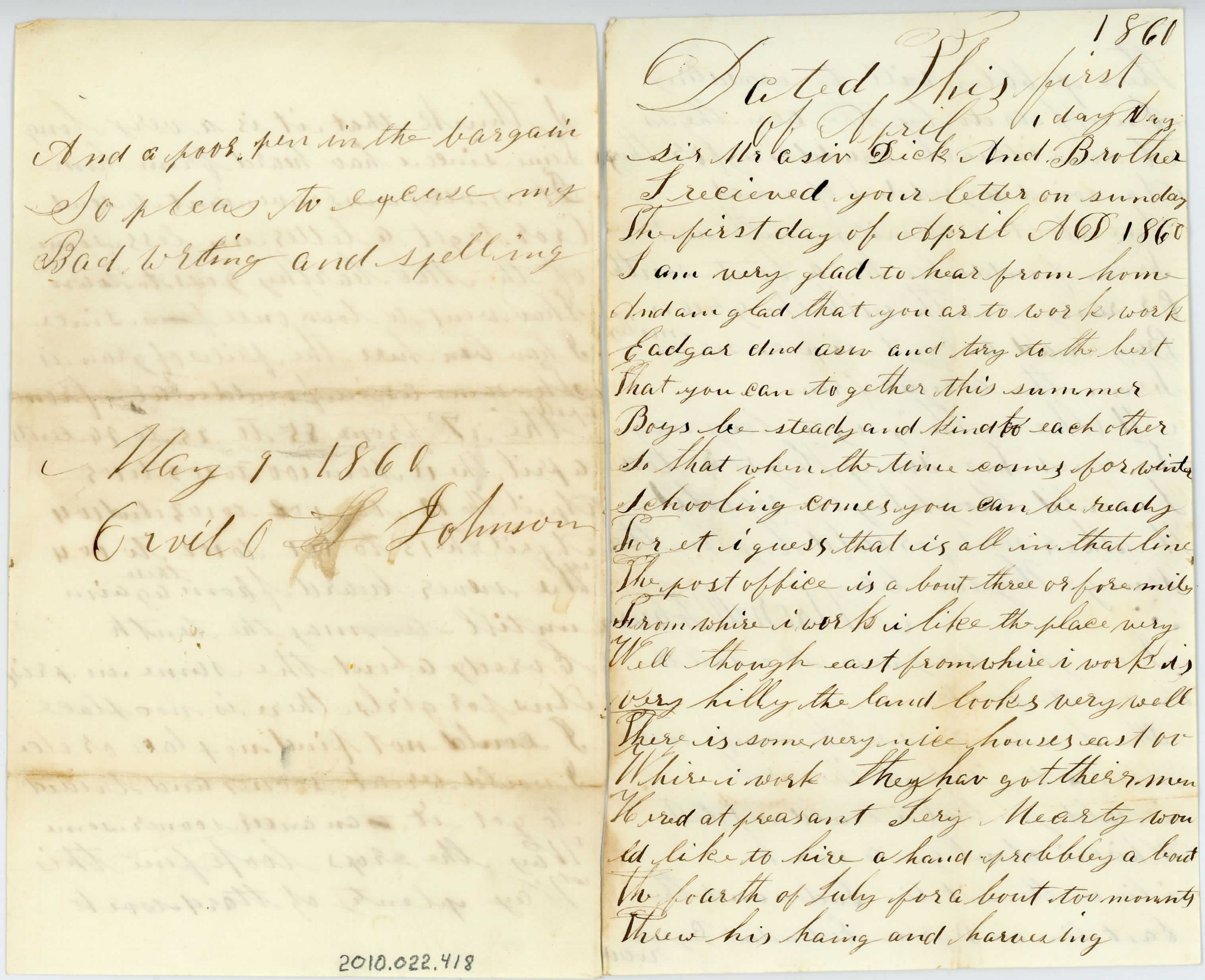 Four page (two sheets) correspondence written in black ink. The first page is addressed to "Dated this first of April day, 1861, Nay. Sir Mr Asin Dick and Brother..." It talks about how the writer is happy he has work, how the writer wants to hire a hand to help harvest. It is signed "May 1, 1861 Orvil L. Johnson".Collection