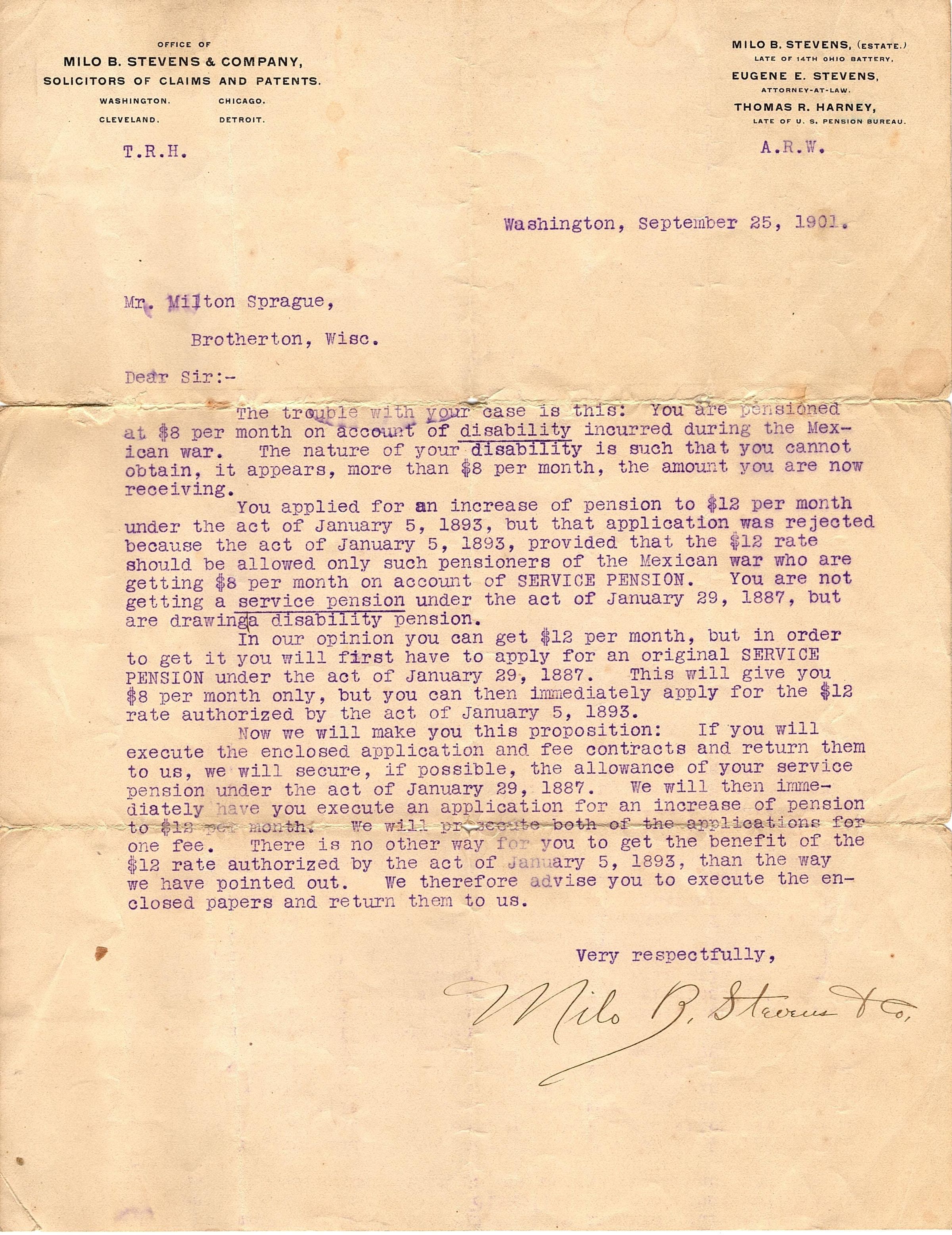 Single sheet of typed correspondence in blue ink on Milo B. Stevens Company, Solicitors of Claims and Patents letterhead. The letter is addressed to Mr. Milton Sprague, Brothertown, Wis. on September 25, 1901. The letter informs Sprague that he is not eligible for an increase of pension because he is receiving the full amount for disability pension and the recent act that raises some is for Service Pensions, not disability pensions. It does offer to apply for a service pension instead and then immediately apply for the increase on his behalf (for a fee). It is signed by Milo B. Stevens and Co.Collection