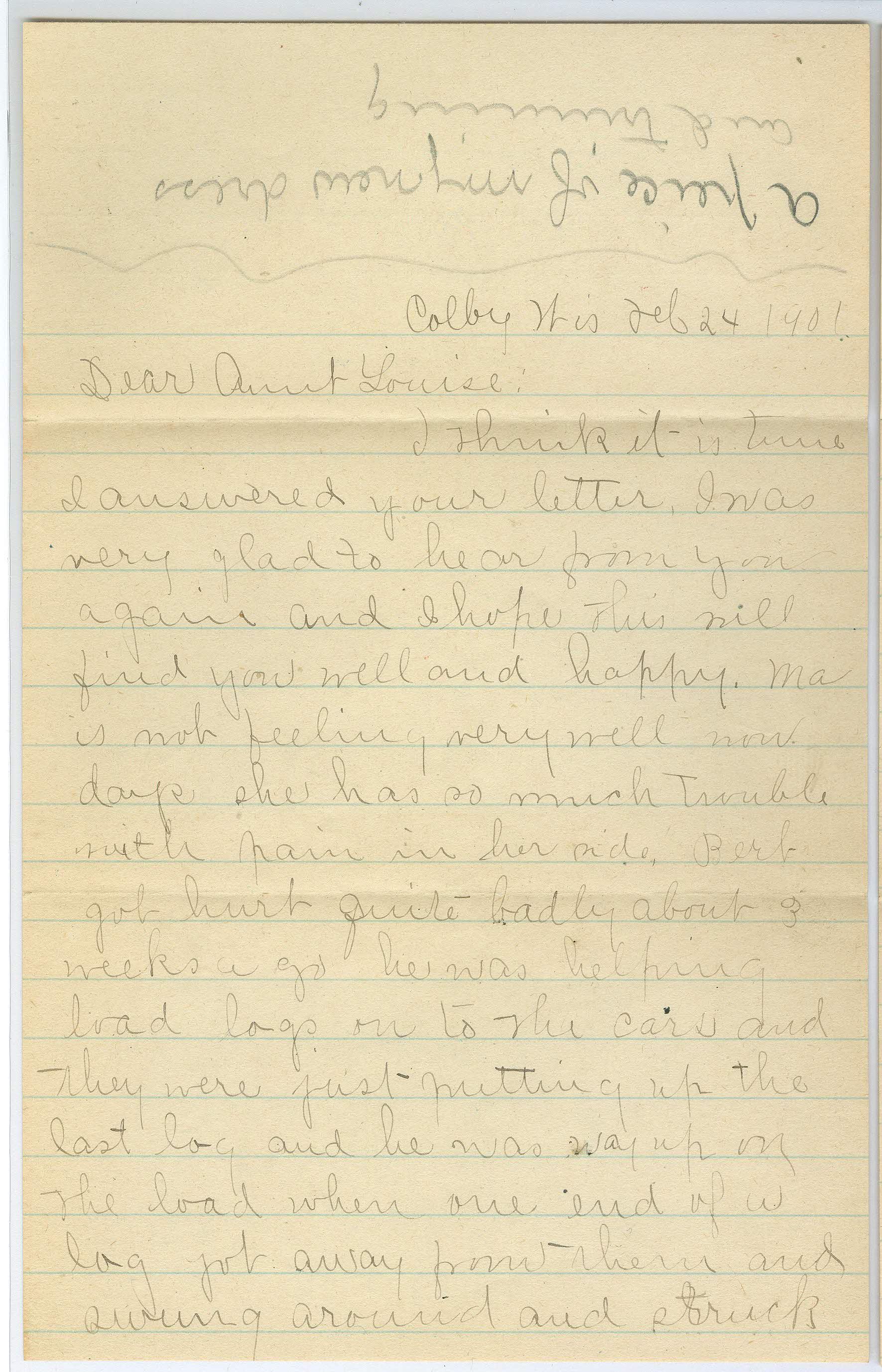 hree page correspondence on two separate pieces of paper. The first page (BC2010.022.622A) is addressed "Colby Wis Feb 24 1901, Dear Aunt Louise". In the top margin of this first page, written upside down is, "A piece of my new dress and trimming". Page two of content is on the backside of this same sheet of paper, written upside down from the first page. It talks about Bert's injury getting hit by a log in the back and now not able to work and how she walks 5 miles a day. The last page of correspondence is on the second piece of paper (BC2010.022.622B) with the number '2' at the top in the center. It is signed "so goodbye, Hattie, love to all". The last page talks about the birth of a boy on Jan. 9 and how the parents wanted a girl, but the baby is getting "so fat and nice".