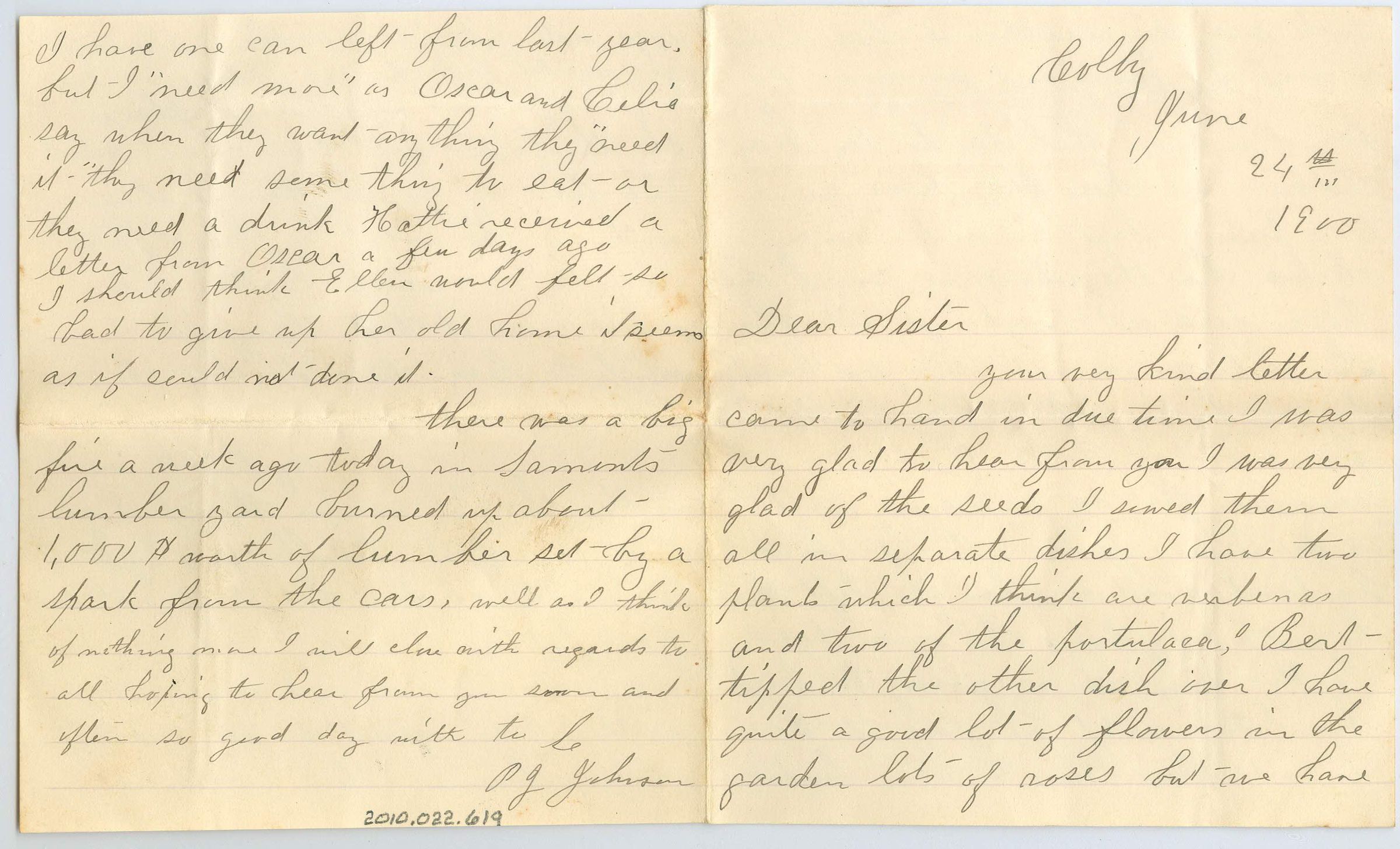 Four pages of correspondence on a single sheet of folded, lined paper. The letter is addressed "Colby, June 24th, 1900, Dear Sister" and is signed on the fourth page (opposite the first page) "so good day with to le, PJ Johnson". The letter talks about the flowers in their garden, Lydia went to Minnesota four weeks ago, but does not like it out there, the weather is dry and the writer doesn't think berries will come in because of it, and finally a fire in a nearby lumber yards.