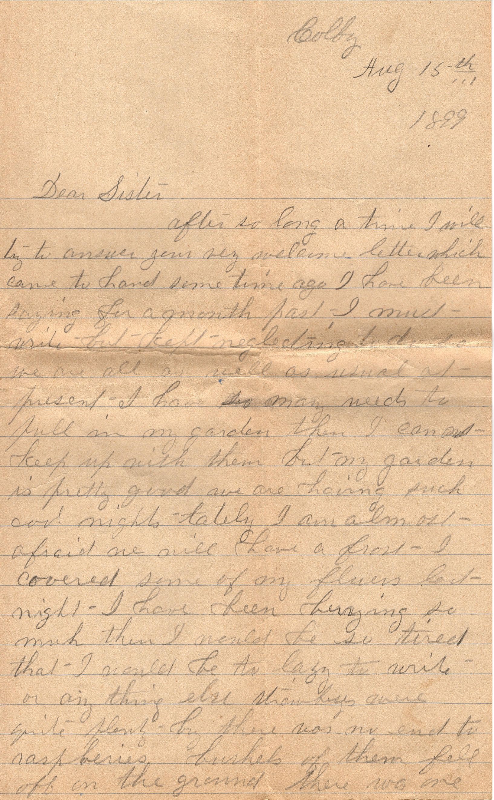 Two page letter to a sister, Mrs. Agnes L. Fowler, from P.J. Johnson. Written Aug. 15, 1899 in Colby. The two pages come with an envelope with a two cent stamp and a newspaper clipping "Found Death in a Well" (BC2010.022.617B).