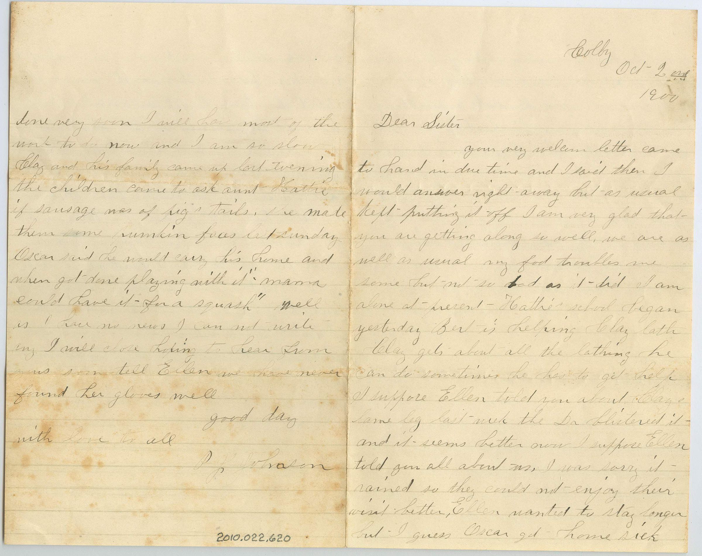 Four pages of correspondence on a single sheet of lined, folded paper. The letter is addressed "Colby, Oct 2nd, 1900, Dear Sister" and is signed on page four (opposite page one unfolded) "Good day, with love to all, PJ Johnson". It talks about Hattie going back to school, Clay's lame leg, a wedding someone is attending, the receiver is thinking of moving and the writer doesn't think Willis would get along anywhere else because of his deafness.