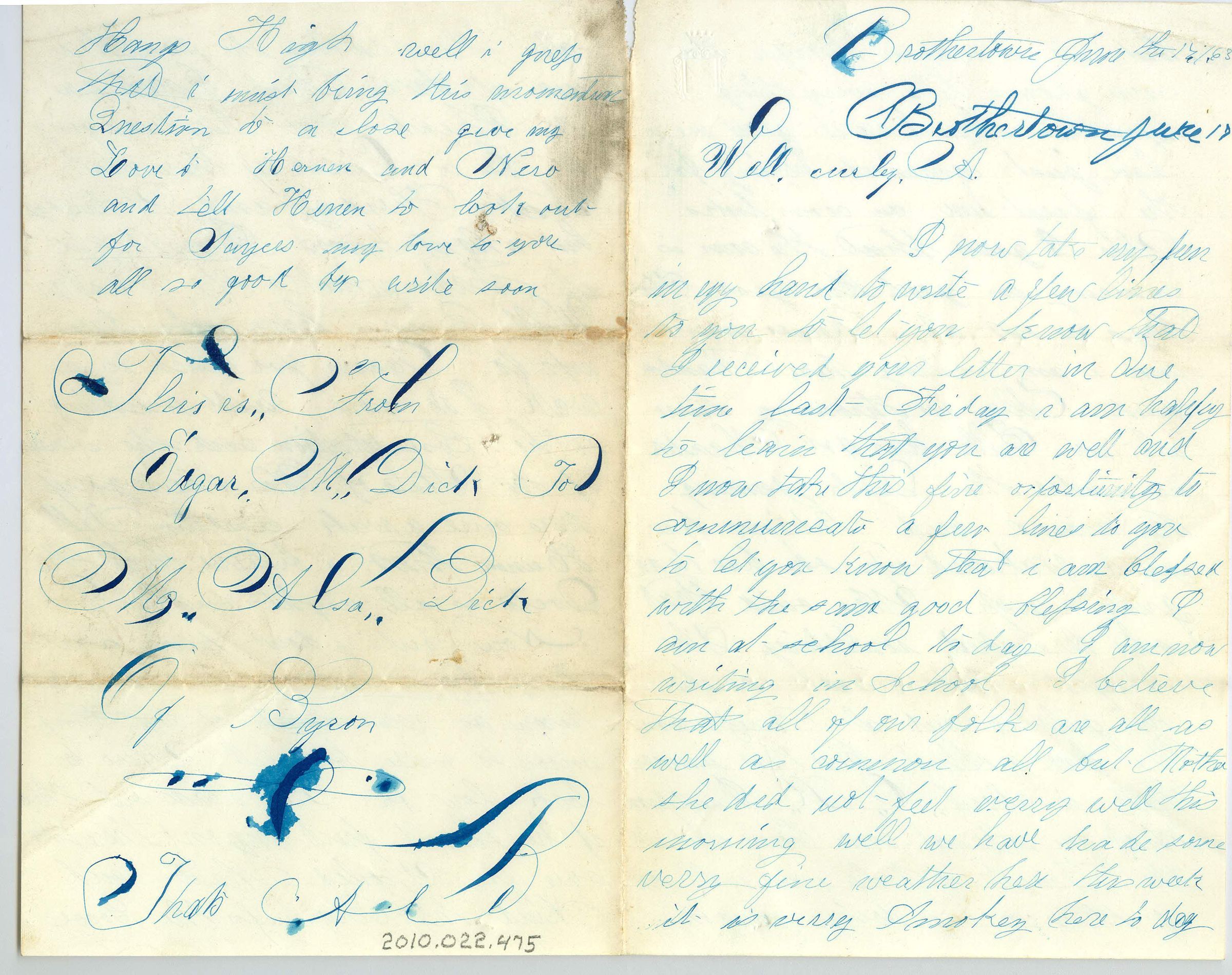Single sheet of folded paper with writing in blue ink on each section (four pages total). The letter is addressed "Brothertown June the 17 /63, Brothertown June 17, Well Curley A." (Asa Dick). It is signed "This is from Edgar M .Dick to Mrs. Asa Dick" with some unreadable swirls at the bottom. The letter is being written in school and just talks about what is going on there.Collection