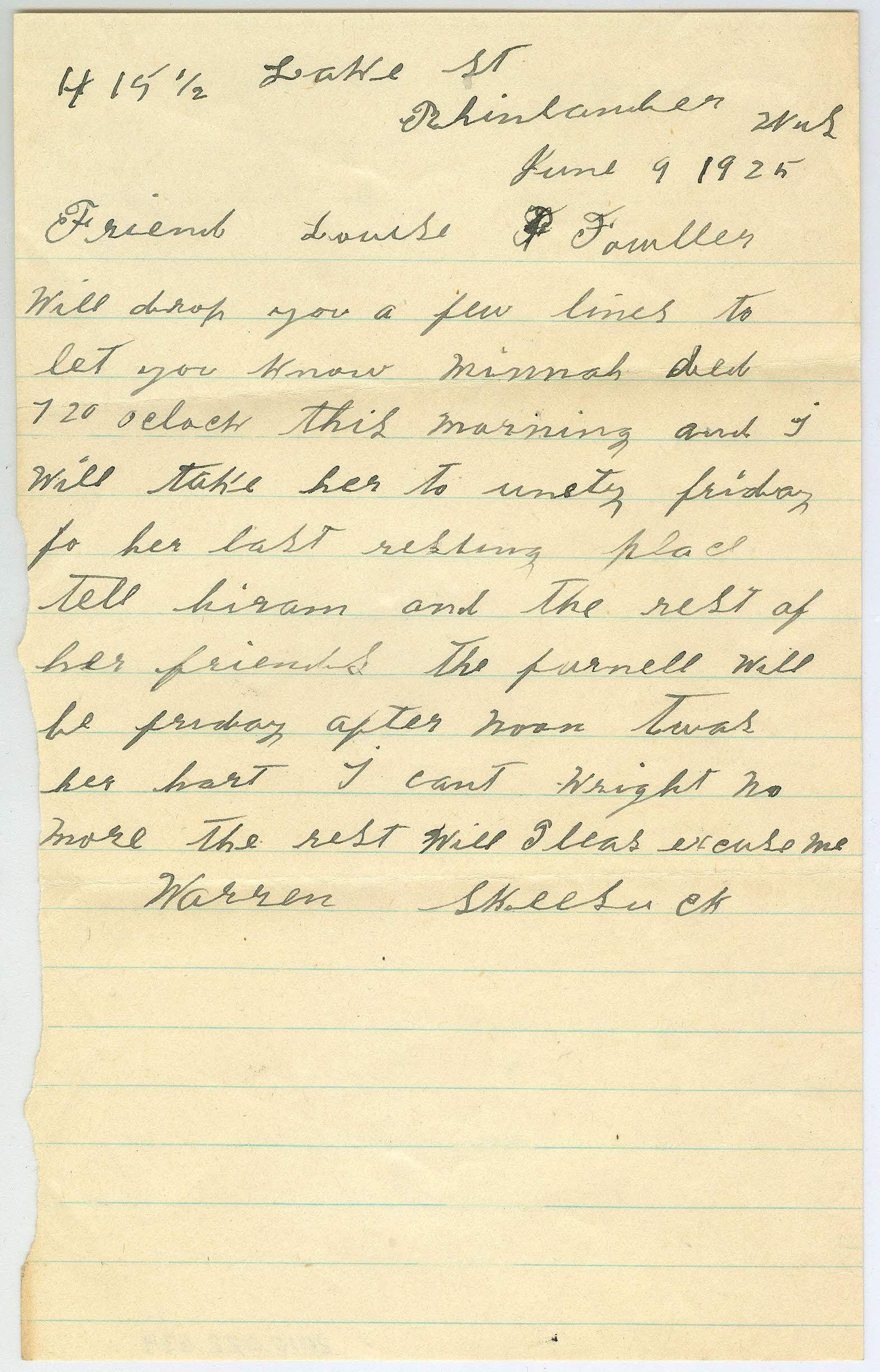 Single page correspondence on a ripped piece of paper. The letter is addressed "415 1/2 Lawe St., Rhinlander Wis, June 9 1925, Friend Louise Fowler, Will drop you a few lines to let you know Minnah died 720 o clock this morning and I will take her to unity friday to her last resting place tell hiram and the rest of her friends the furnell [sic] (funeral) will be friday after noon twas her hart i cant wright no more the rest will pleas excuse me, Warren Skeesuck."