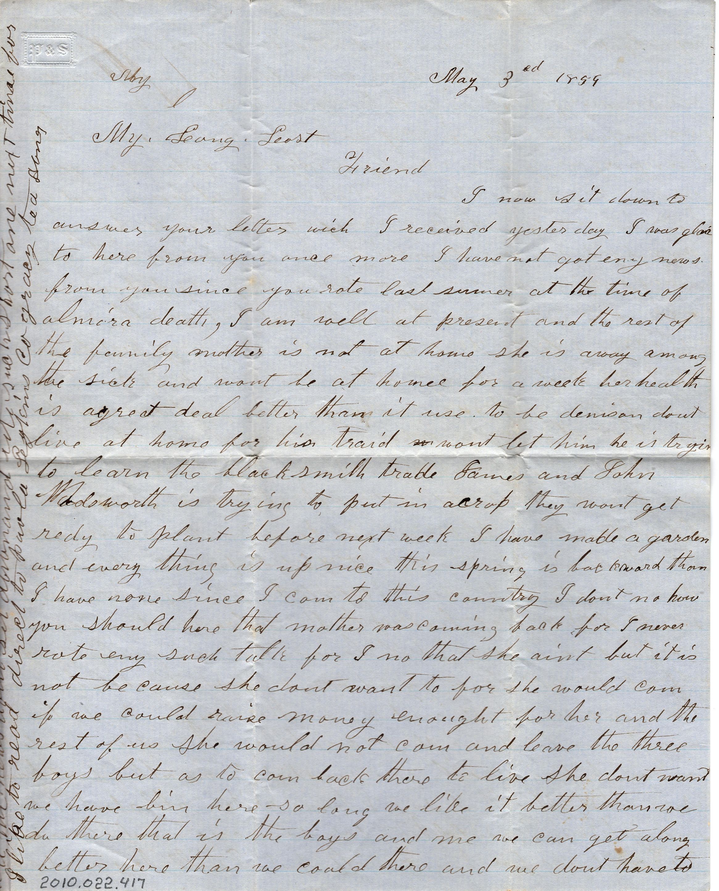 Two pages of correspondence (four written pages) on blue paper.. The letter is addressed "Aby, May 3rd 1859, My Long Lost Friend". The two have not spoken in nearly a year so it contains just information about their life. The letter is not signed so unsure who it is to or whom it is from.Collection