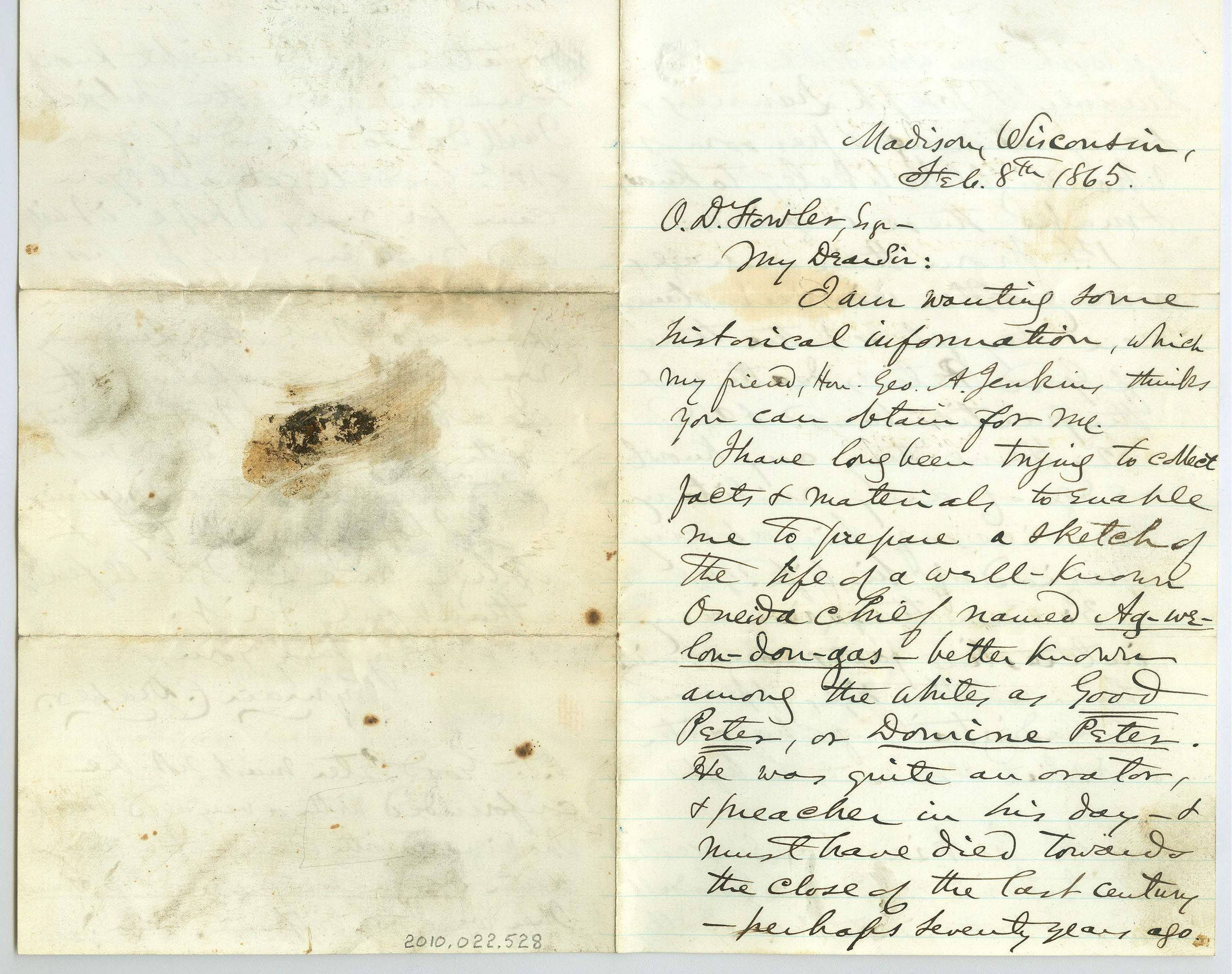 Three pages of correspondence on a single sheet of paper. The last page (fourth page) is blank and is the only page that doesn't have light blue lines. The letter is addressed "Madison, Wisconsin, Feb. 8th 1865, O.D. Fowler Esq, My Dear Sir." The letter is asking for historical information about Oneida chief, Ag-we-lon-don-gas a.k.a. Peter or -- Peter. I think the writer means Peter Agwrongdougwas or "Good Peter" who was known as a great orator. The letter is signed "I hope you will try to oblige me. Shall feel thankful for it. Very truly yours, Syman C. Draper". There is a PS that makes me think that it might not be "Good Peter" either. It says "P.S. -- Good Peter must not be confused with a very -- Oneida who migrated with his people to Wisconsin rather De-ga-Lou-yo-hu or Peter Somers. They were very different men".Collection
