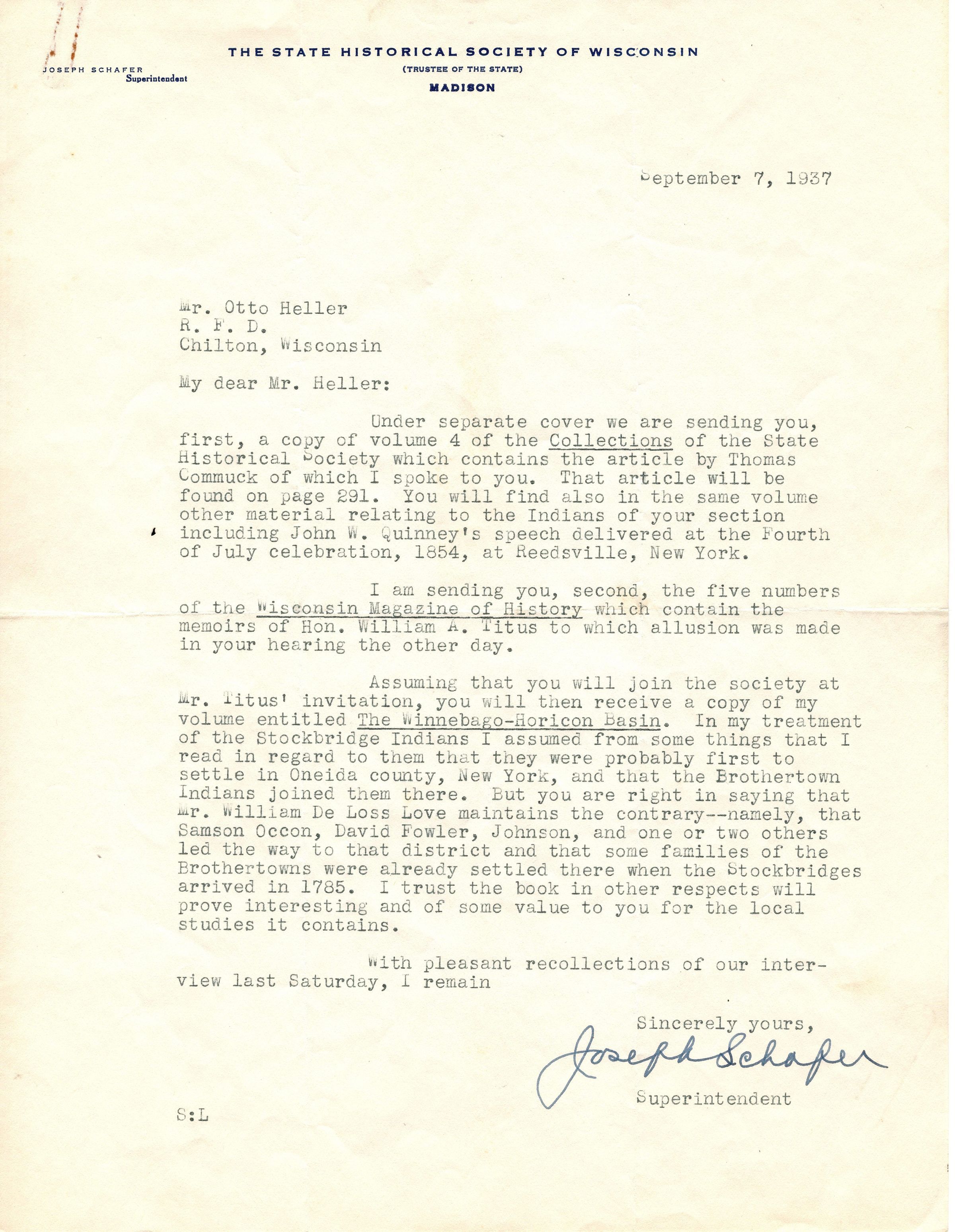 Single page, typed correspondence on The State Historical Society of Wisconsin letterhead. It is addressed "September 7, 1937, My dear Mr. Heller" and talks about a copy of a book they are sending Heller with information about Thomas Commuck and John W. Quinney's speech on July 4, 1854 in Reedsville, New York. It is also sending him the numbers for the Wisconsin Magazine of History that have information on Hon. William A. Titus. It invites Heller to a meeting where he will receive a copy of Joseph Schafer's volume The Winnebago-Horicon Basin. This volume and this letter talk about the discrepancies between Schafer's finding of who came to Wisconsin first (Stockbridge or Brothertown) and De Loss Love's finding that Brothertown was first. It is signed Joseph Schafer.Collection