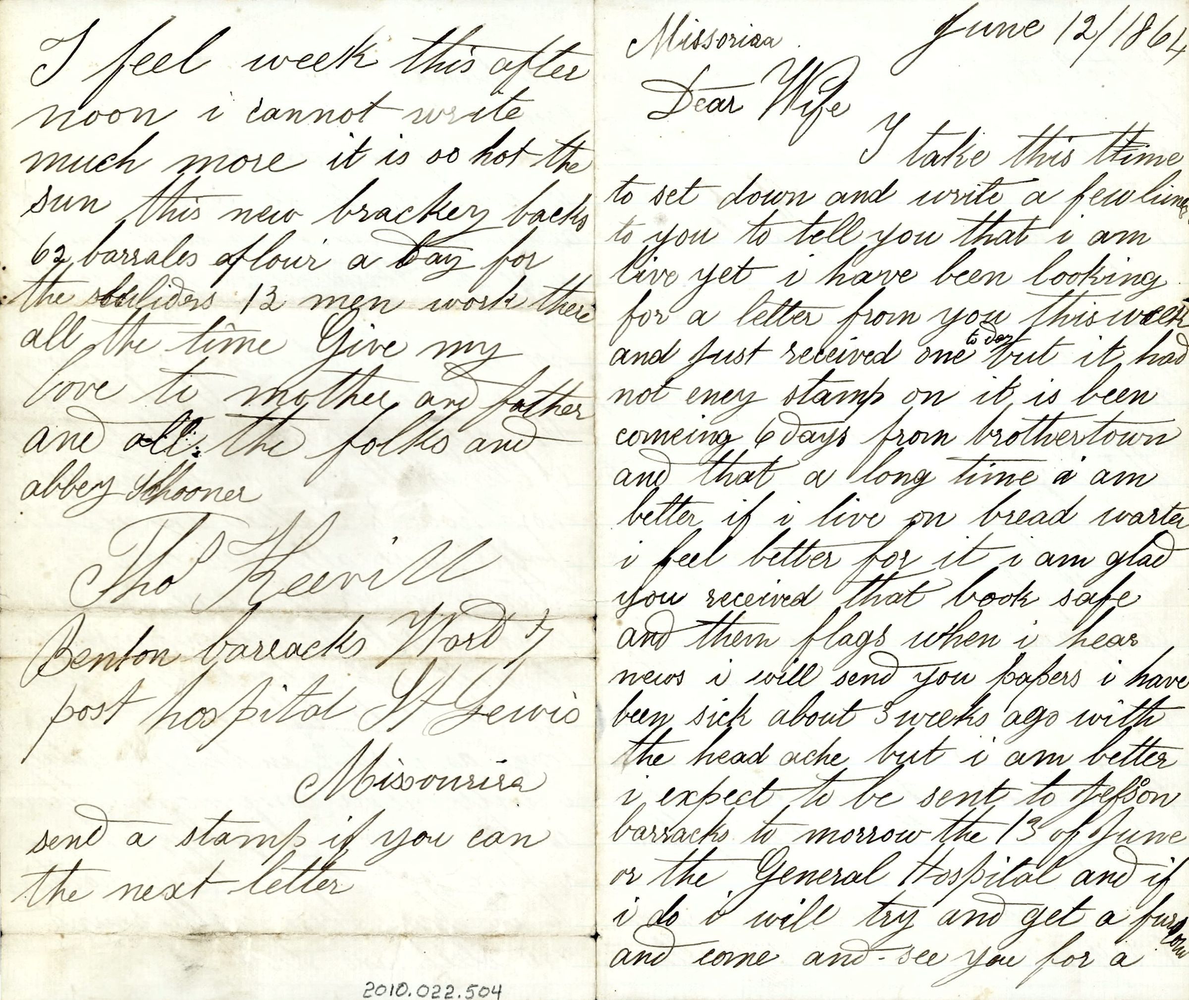 Four pages of correspondence on a single sheet of folded paper. The ink is black and addressed "Missoriaa [sic], June 12/1864, Dear Wife" and is signed "Tho Keevill, Benton Barracks Ward 7 post hospital St. Louis, Missourira [sic], send a stamp if you can the next letter". It talks about how he's been sick for three weeks, but expects to either be sent to the barracks tomorrow or the general hospital. He doesn't have small pox and believes the war will end in the fall. He talks a lot about furlough.Collection