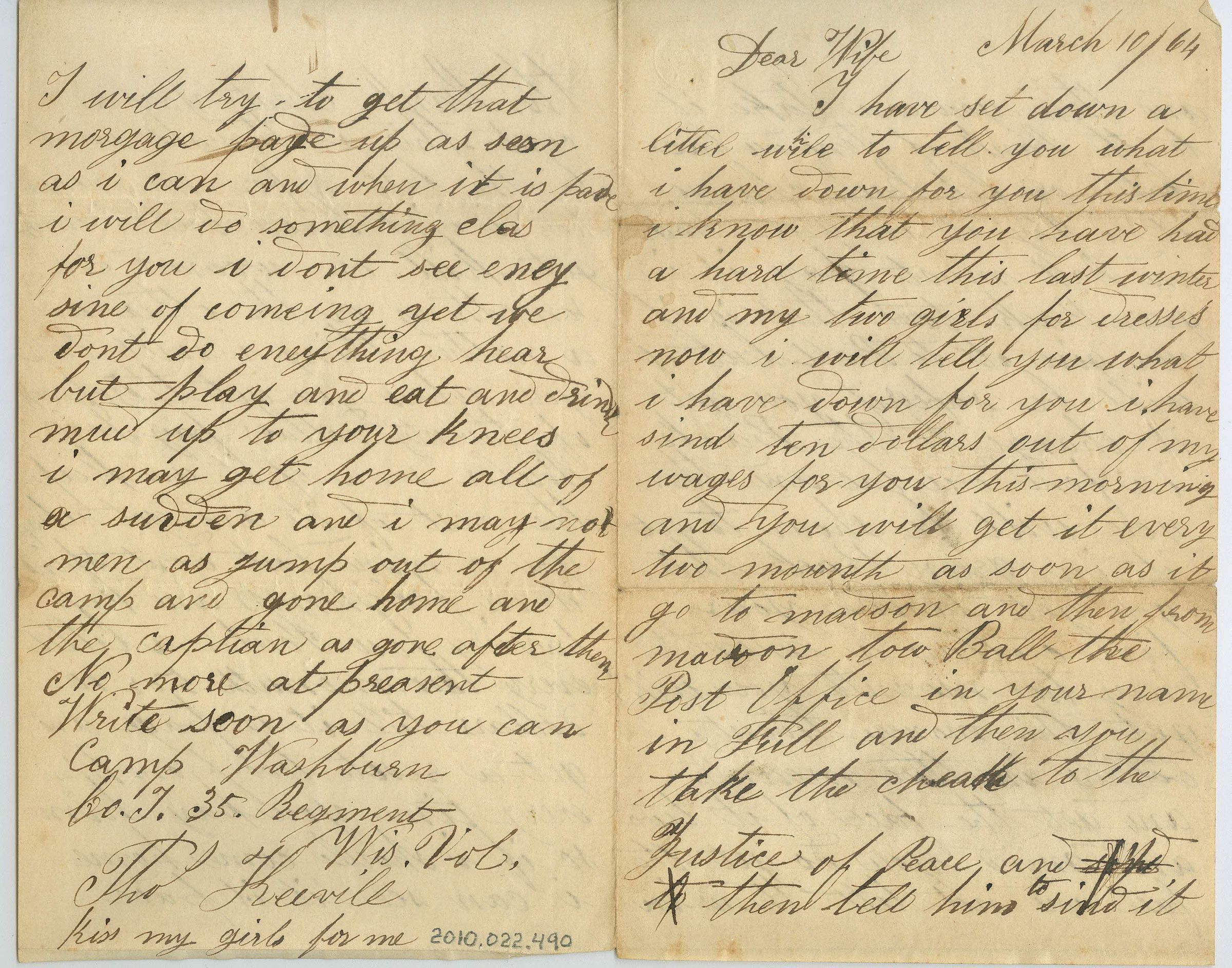 Single sheet of paper folded in half to create four pages of correspondence. The paper is a cream color. The letter is addressed "Dear Wife, March 10 /64" and is signed "Tho Keevill, Kiss my girls for me". It talks a lot about a check she is supposed to cash and what to do with the "green back".Collection