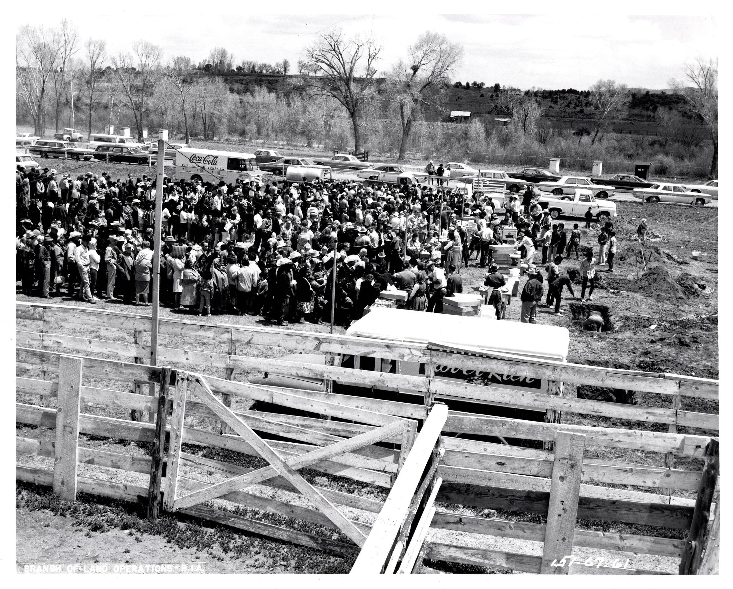 Black and white photograph of a crowd standing outside at a food gathering. There are tables in front set up with a lot of boxes stacked on top. Two rows of cars line the street in the background. There is a Coca Cola truck in the back as well. Typed along the bottom corner of the picture reads "Branch of Land Operations - B.I.A." and written in white ink on the opposite corner "151-67-61".Collection