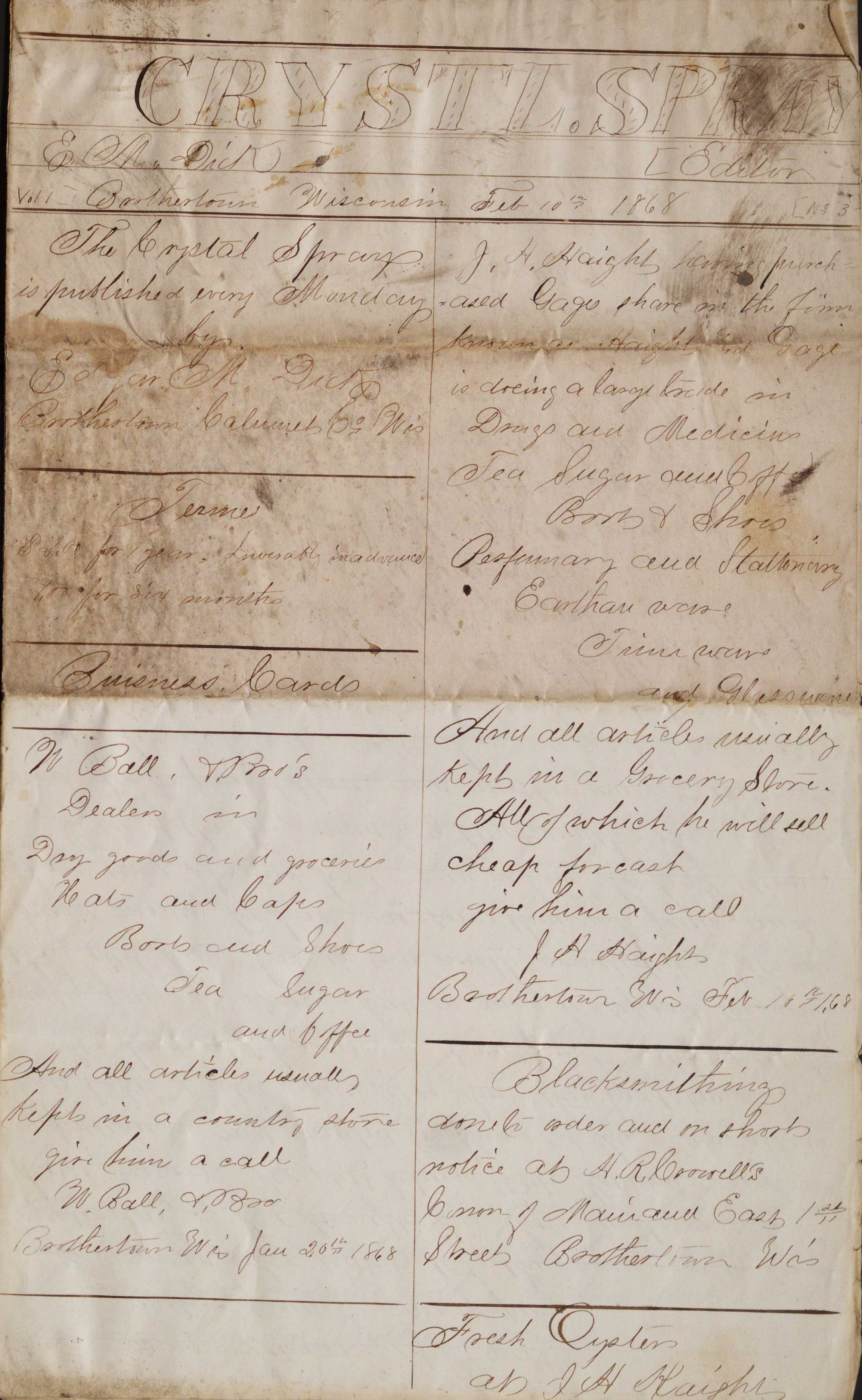 Handwritten newspaper on legal sized paper with the heading "Crystl.Spray" (Vol. 1, No. 3) dated Feb. 10th 1868 and edited by E.M. Dick.Collection