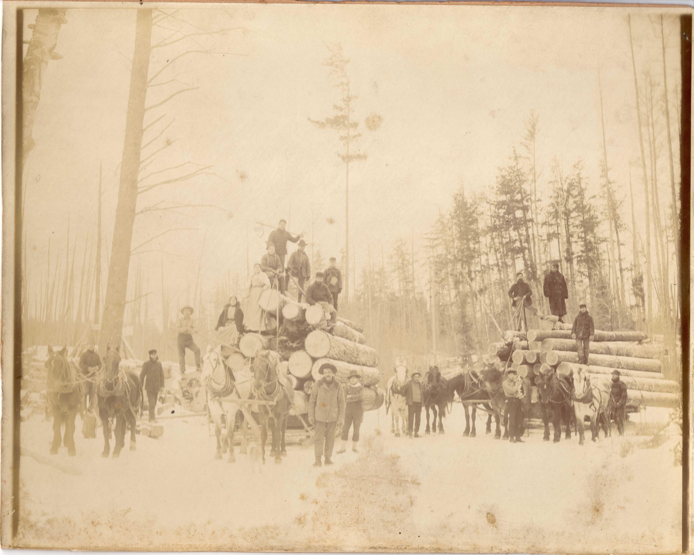 Black and white photograph of a logging crew. There are two large piles of logs being pulled by horses. Two horses stand to the left with two men behind them. In the middle pulling one of the log piles are two horses and eight people sit/stand on top of the logs with two standing to the side. There is a man between the two log piles holding two horses by the reigns. There are four more horses in front of the second log pile with two men standing near them, one is holding a puppy, and three men standing on top of the log pile. There are in a wooded area.