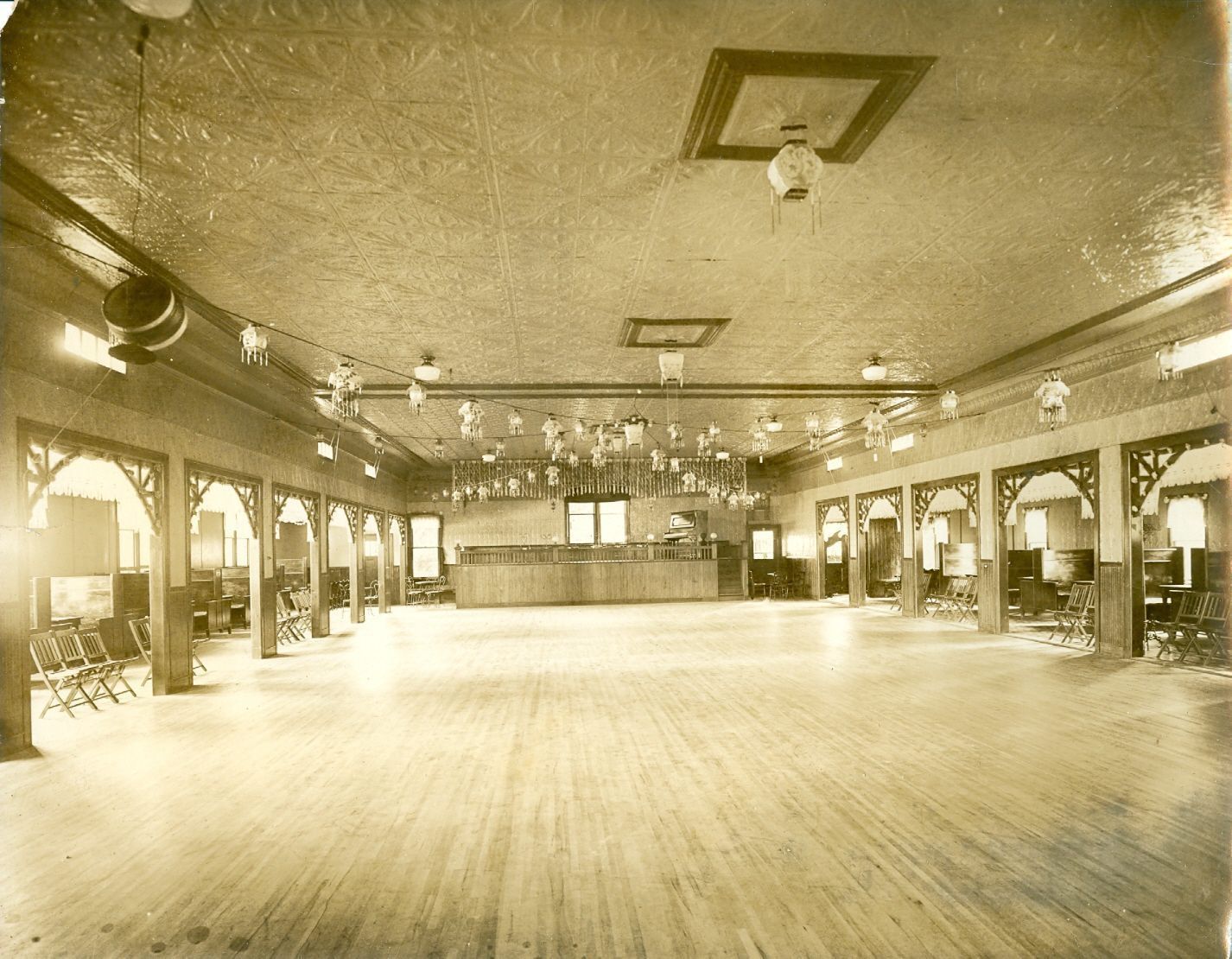 Black and white photograph of a large hall with a stage in the front. On the stage is an upright piano. The floor is hardwood and the ceiling is made out of the aluminum tile. There are wings to the hall where folding chairs are set up.Collection