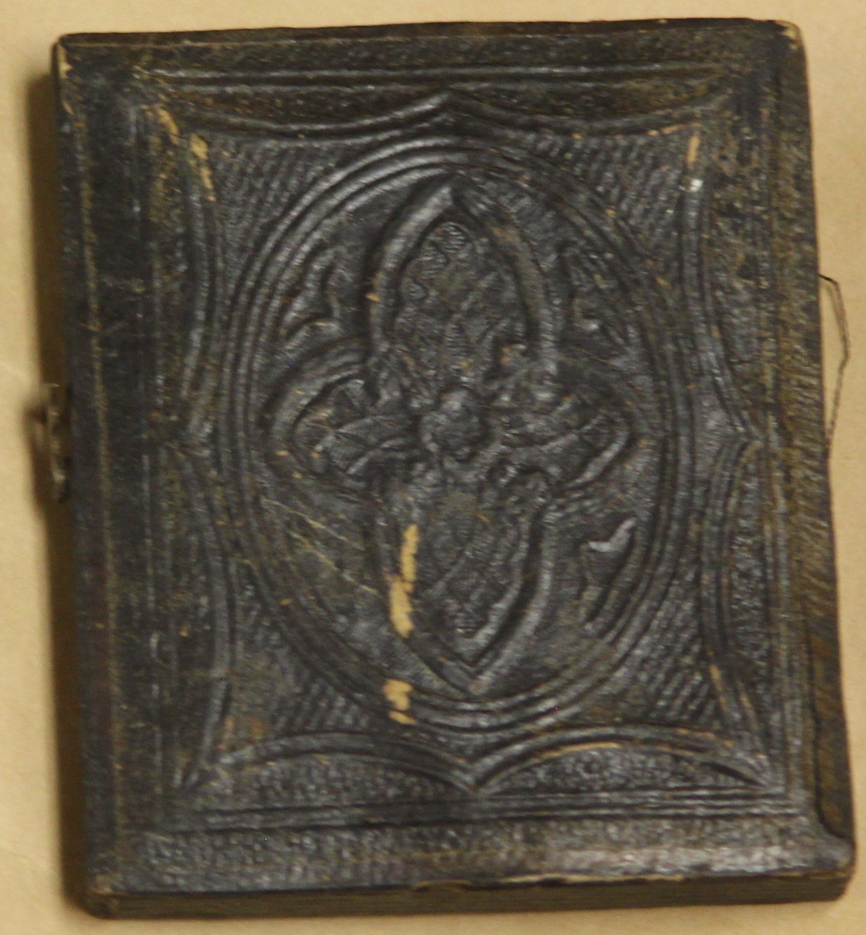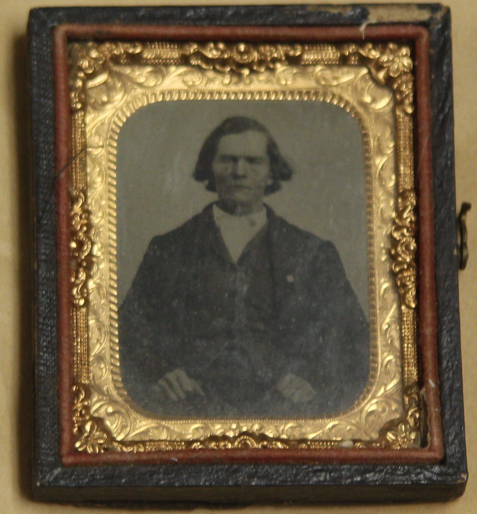 Tintype of a middle aged man in a suit and vest with a pin on his lapel. His hair is longer and his hands appear to be in fists on his thighs. The tintype is framed with a gold metal decorative piece and is in a wood, latched book. The front cover of the book has a four pointed design with a clover in the middle. The book came in an envelope with "David Smith #47" written on it. This is most likely O.E. Heller's organization system.