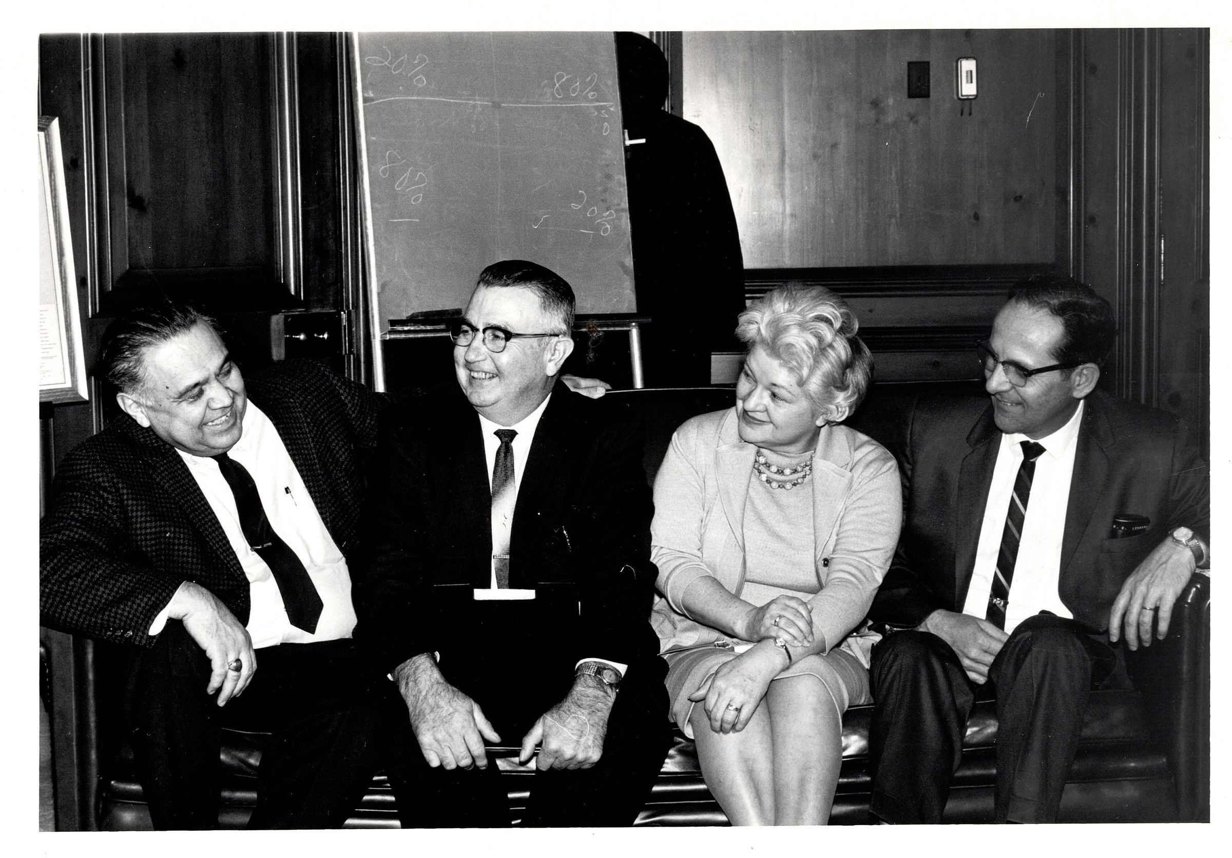 Black and white photo of four individuals sitting on a leather couch. Robert Bennett is on the far left with a man, woman, man to his left. The back reads "Delegation from Miami Tribe, Oklahoma, visits. Mrs. Erma Walz, Tribal Relations Chief and Commissioner Robert Bennett in Washington."Photograph Details