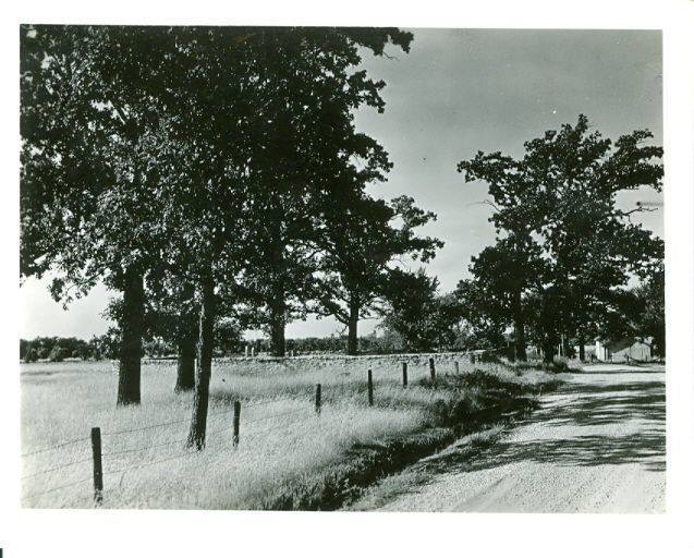 Black and white photograph of a dirt road with a building at the end and a field next to it. There is a wire fence with posts along the road and on the other side of the fence is a rock wall structure. Trees also dot the field.