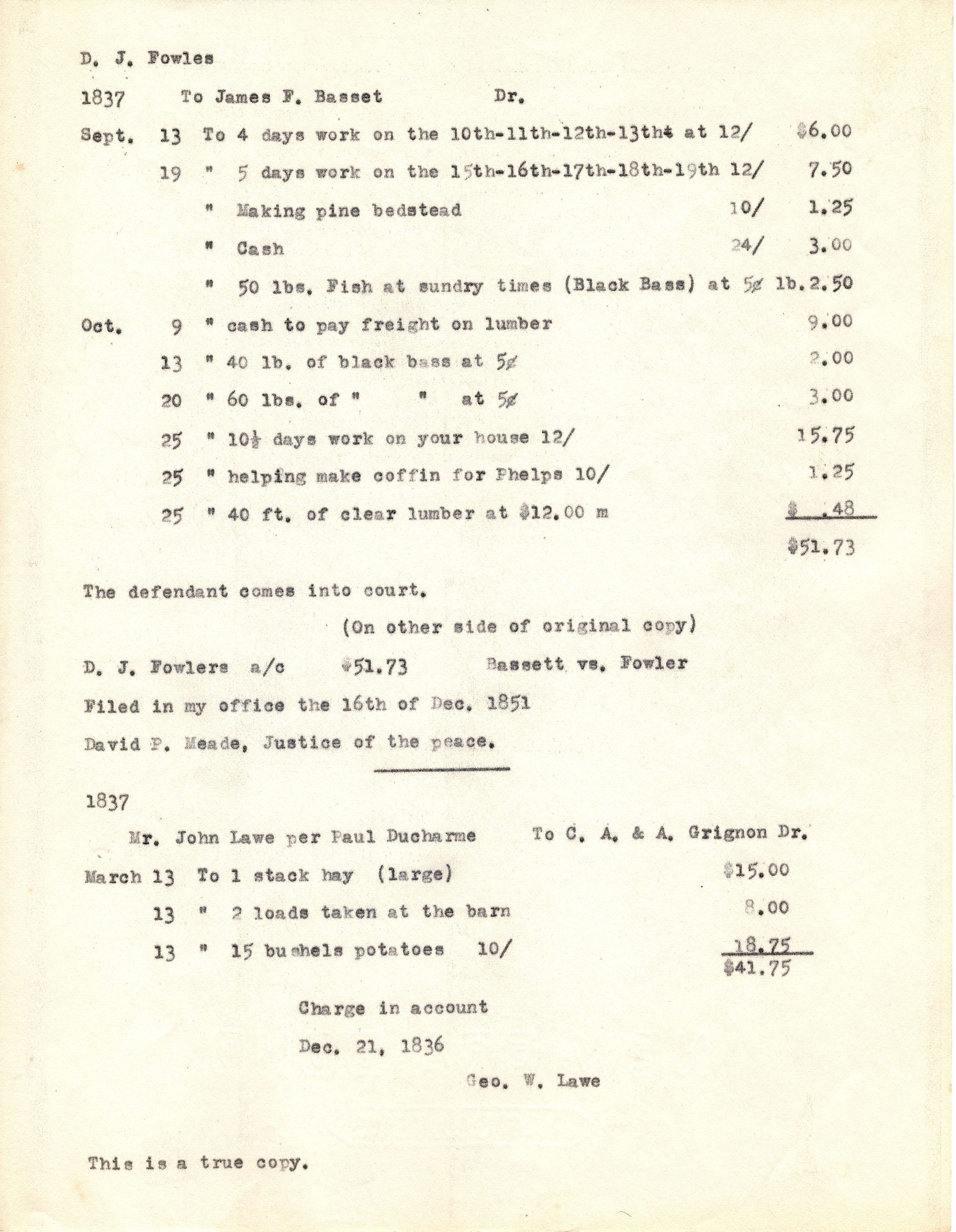 Single page of typed information that lists expenses and wages. At the top is D.J. Fowler, 1837 to James F. Basset, Dr. and the expenses come from Sept. and Oct. After the list of expenses it reads "The defendant comes into court. (On other side of original copy) D.J. Fowlers a/c $51.73 Bassett vs. Fowler, Filed in my office the 16th of Dec. 1851, David P. Meade, Justice of the peace. 1837 Mr. John Lawe per Paul Ducharme To C.A. &A. Grignon Dr.Collection