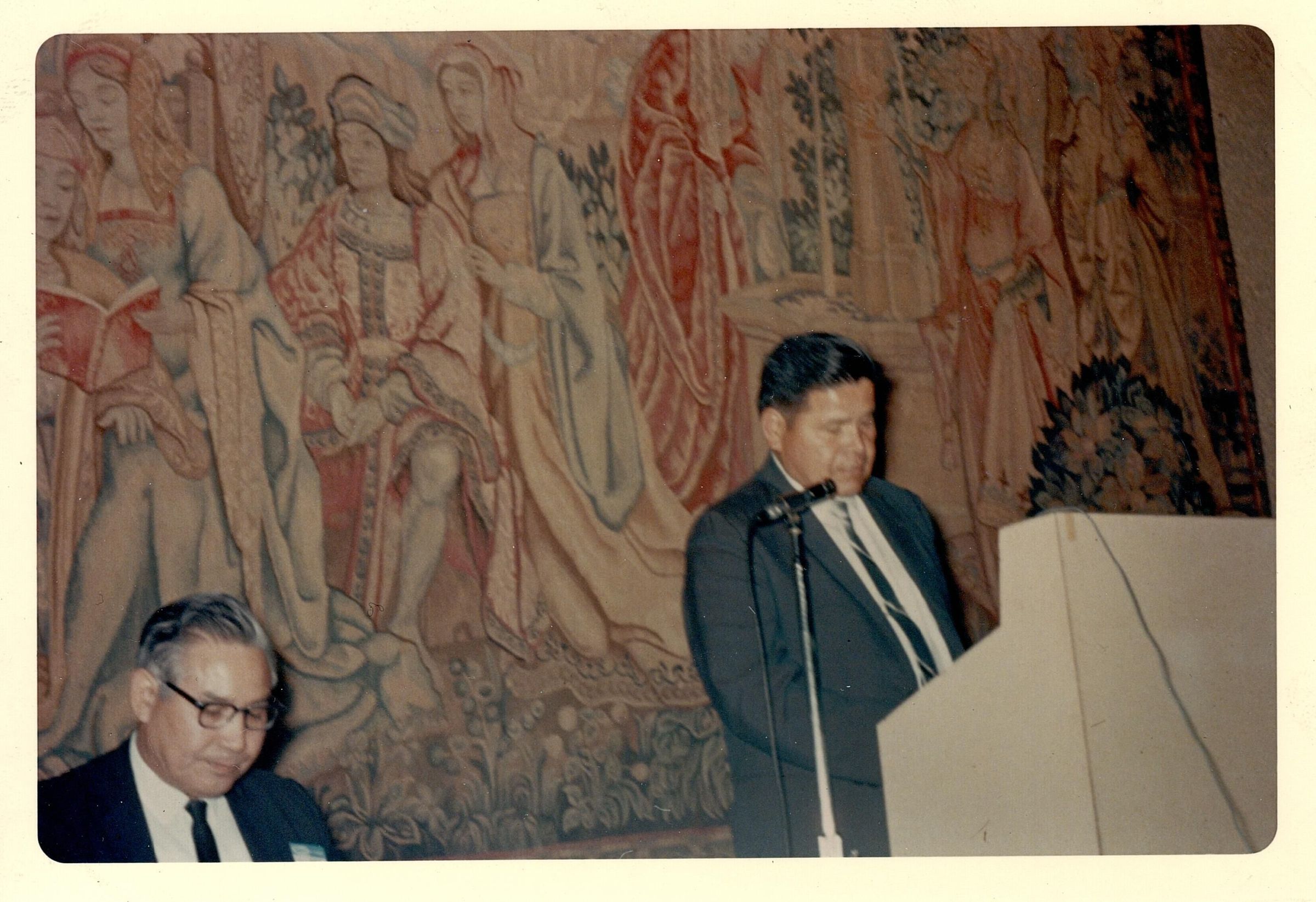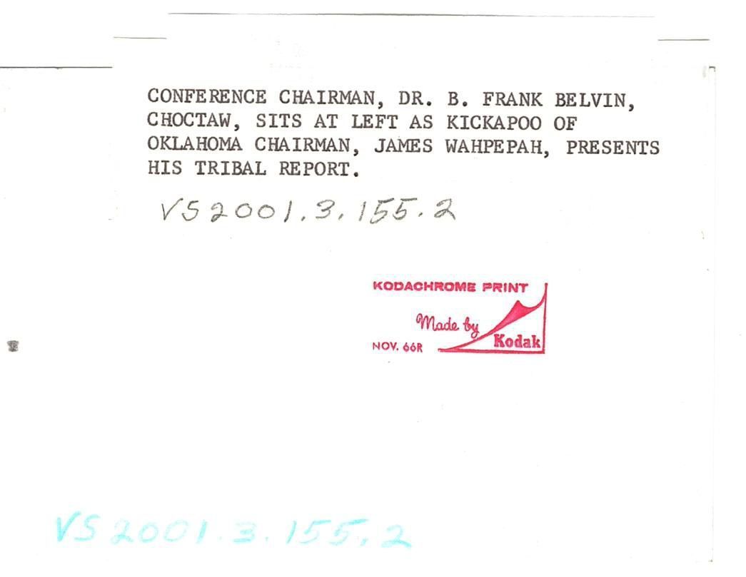 Colored photo of a man speaking from behind a podium next to a man sitting. There is a large tapestry behind them of medieval men and woman around a fountain. The back reads "Conference Chairman, Dr. B. Frank Belvin, Choctaw sits at left as Kickapoo of Oklahoma Chairman, James Wahpepah, presents his tribal report."Photograph Details