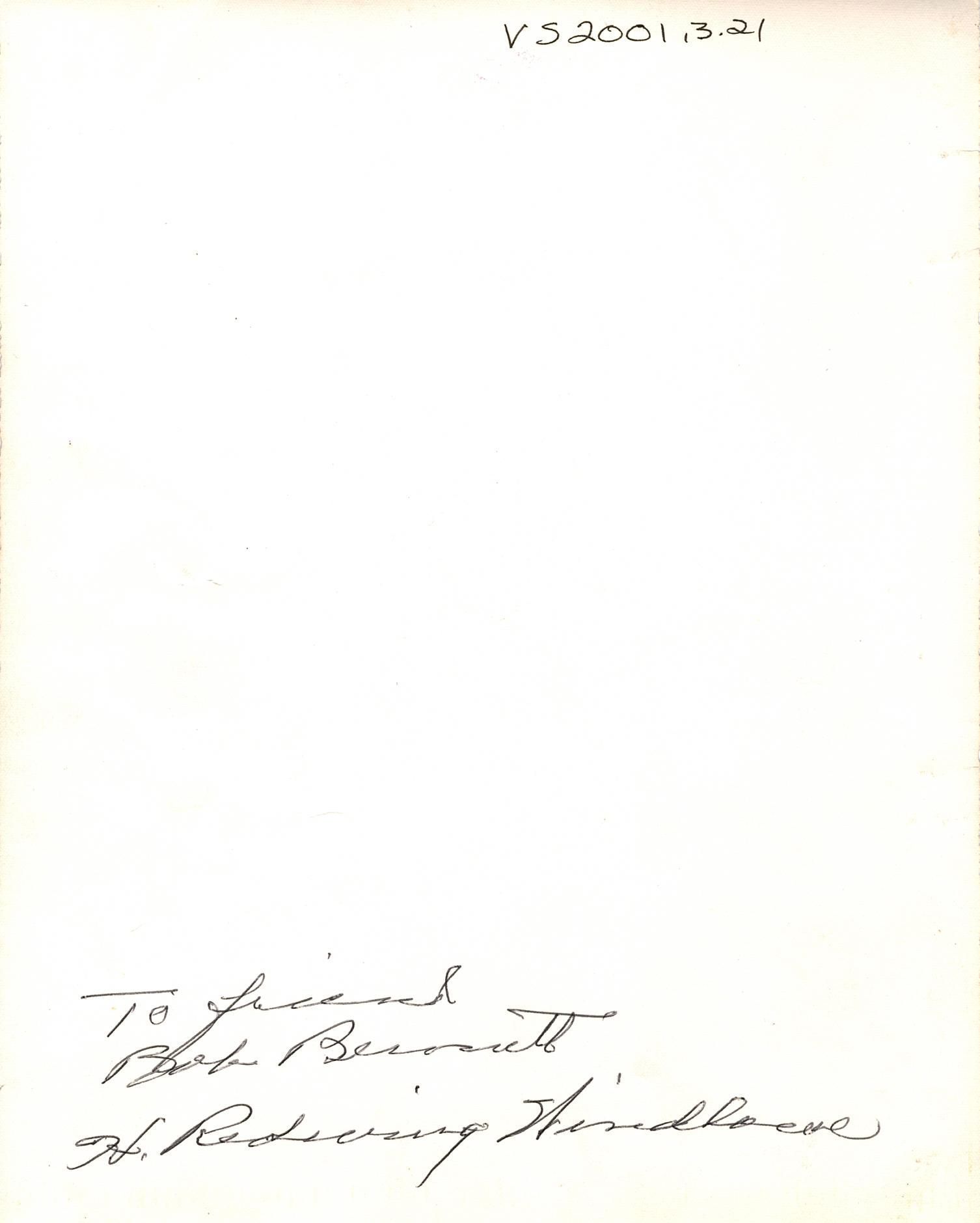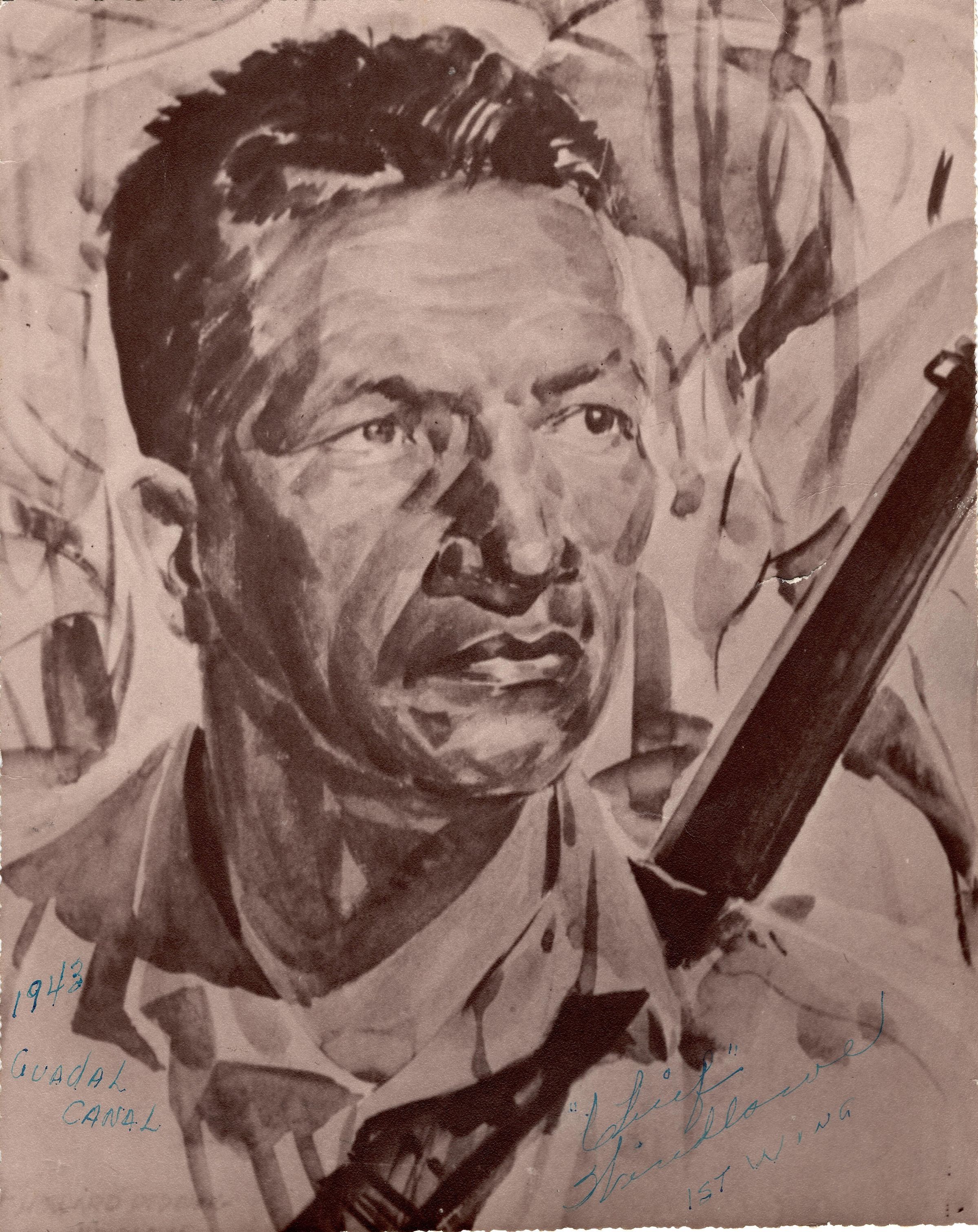 Drawing in charcoal of a man with possibly a gun across his back. He is looking slightly to the left. Written in blue ink near the left bottom corner "1943 Guadal Canal" and in the opposite corner "'Chief' S--" 1st wing". Written on the back in black ink "To friend Bob Bennett, H. Redwing S--".Collection