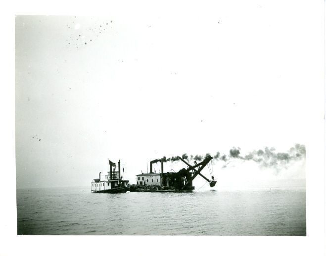 Black and white photograph of a dredger on water. Written in black ink on the back "Dredging at Brothertown".Collection