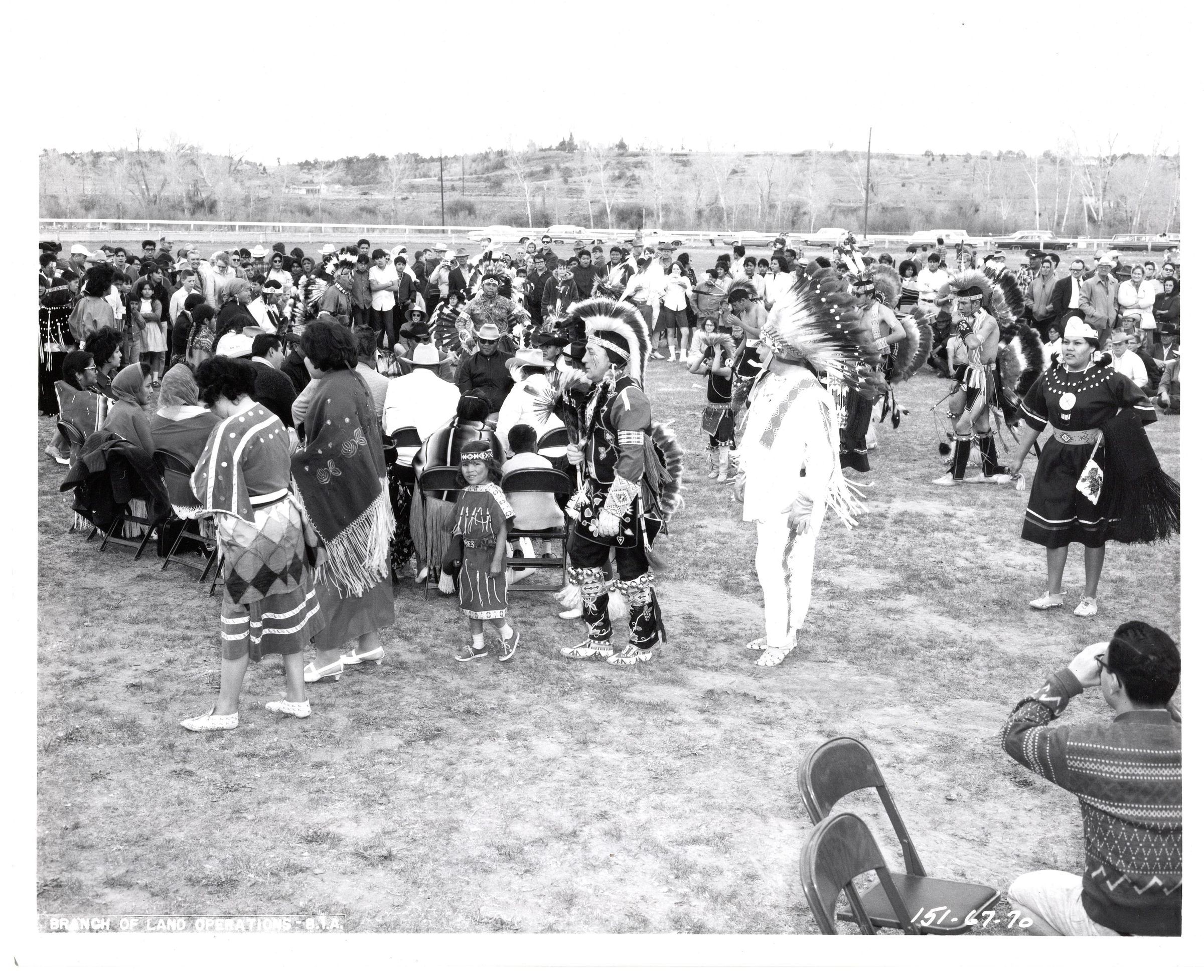 Black and white photograph of dancers around a drumming circle at a powwow. There is a crowd in the background. The man in the middle of the photo is wearing a large roach and bustle and the man behind him is wearing a headdress and all buckskin shirt and pants with fringe. There is a small child in front of the man with the roach. Typed in the bottom left corner of the photo "Branch of Land Operations - B.I.A." and in white in the opposite corner "151-67-70".Collection